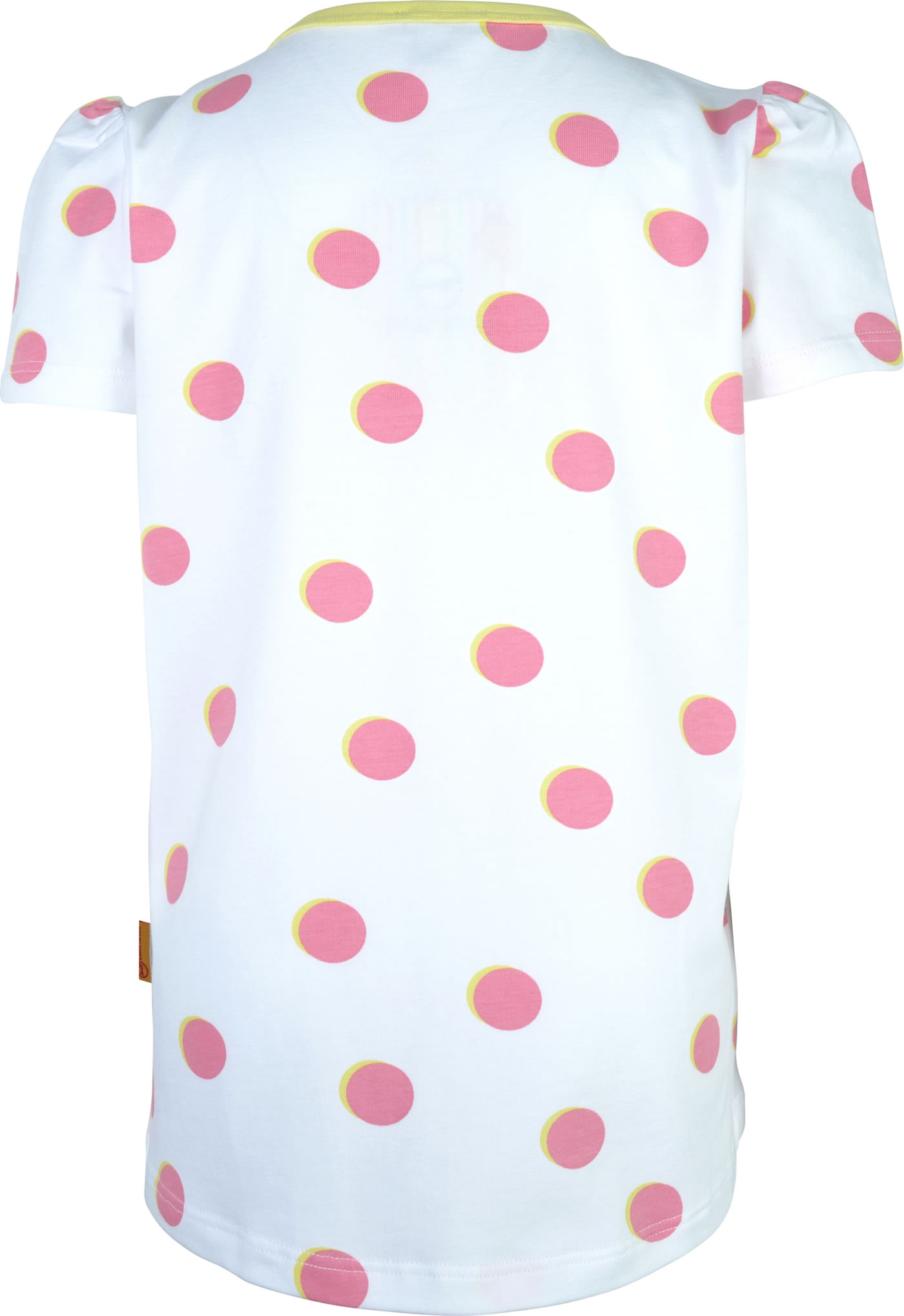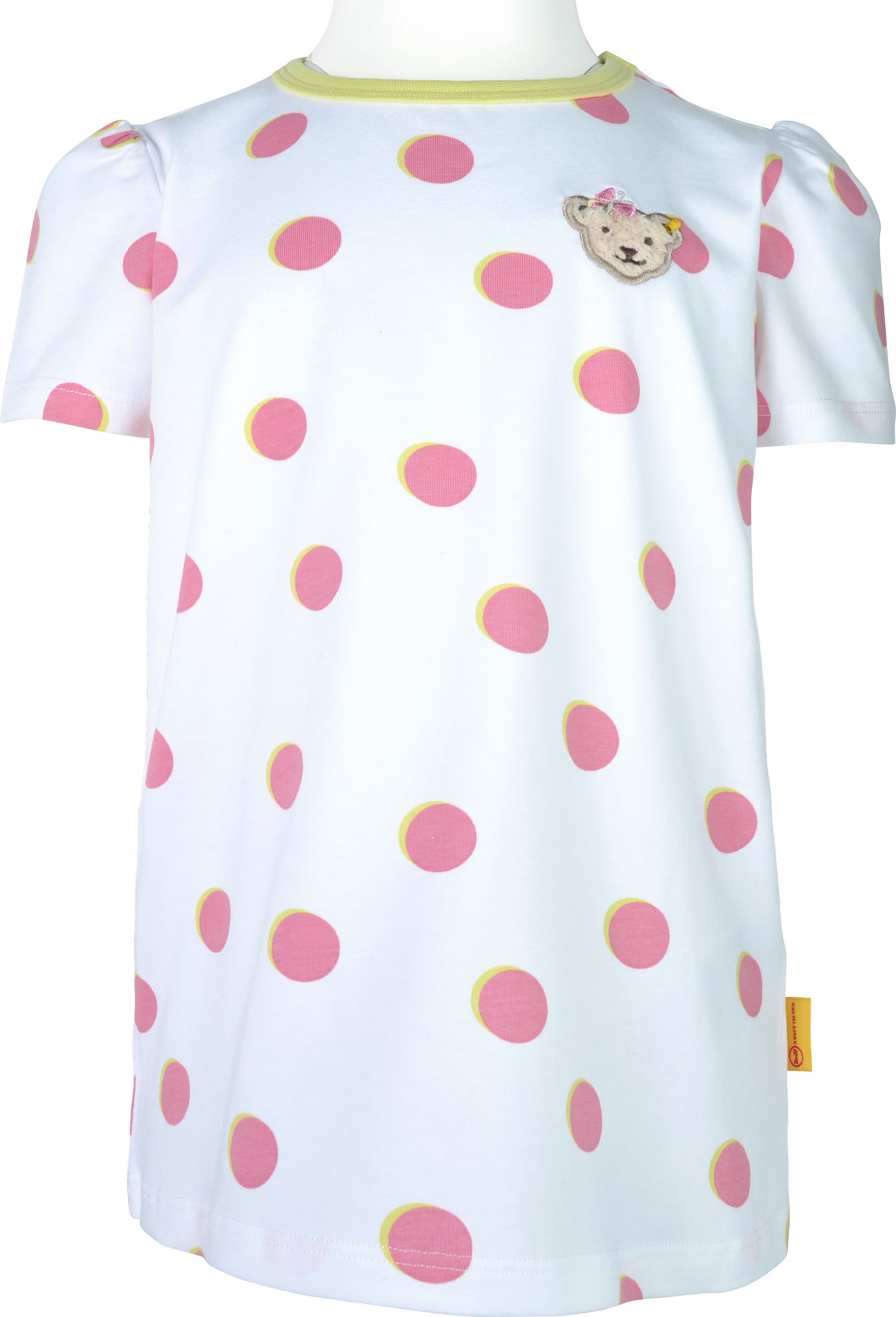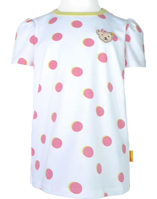 Kurzarm-Shirt für Mädchen aus der Garden Party-Kollektion von STEIFF. Das gepunktete Shirt hat geraffte Ärmel. Der STEIFF Bär mit Schmetterling ziert die Vorderseite. Die Rückseite ist etwas länger geschnitten.