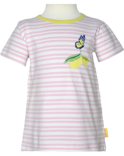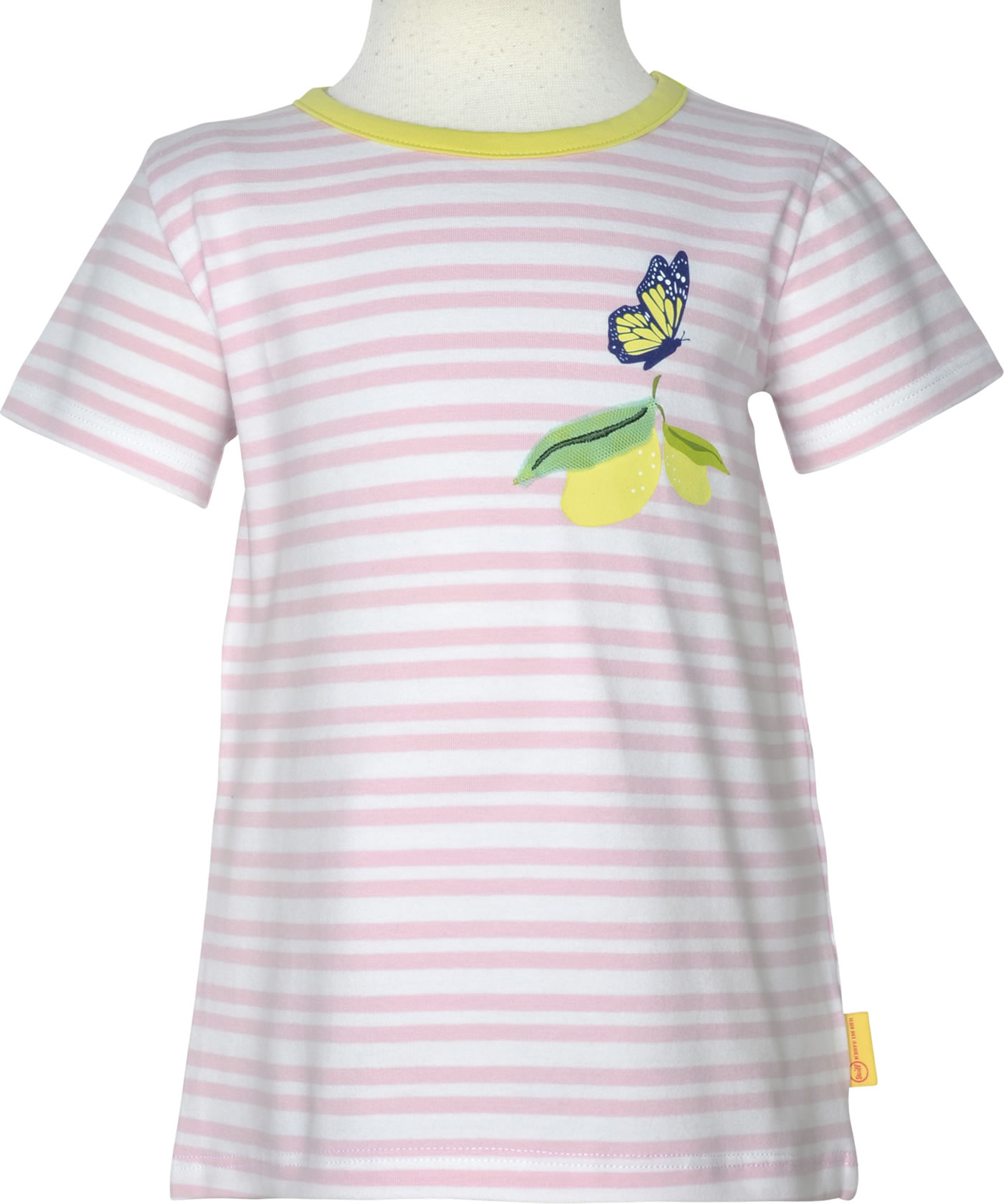 Gestreiftes Kurzarmshirt für Mädchen aus der Hello Summer Kollektion von STEIFF. Der STEIFF Bär befindet sich auf der Rückseite. Besonders schöne Details sind die farblich abgesetzte Paspel am Kragen und der Print mit Schmetterling und Zitronen. Die Rückseite ist etwas länger geschnitten.