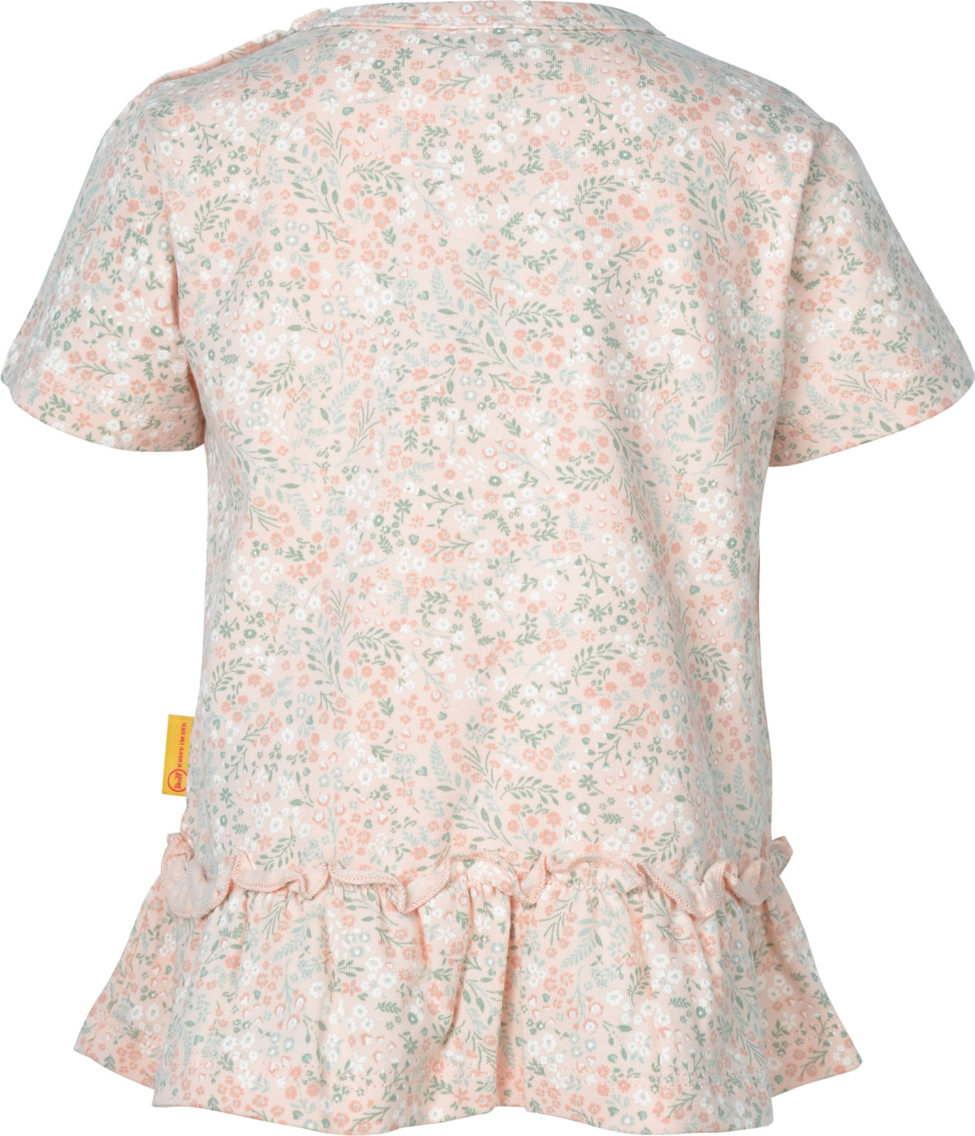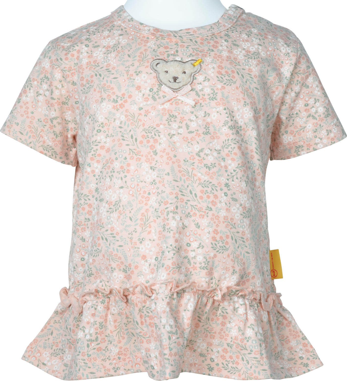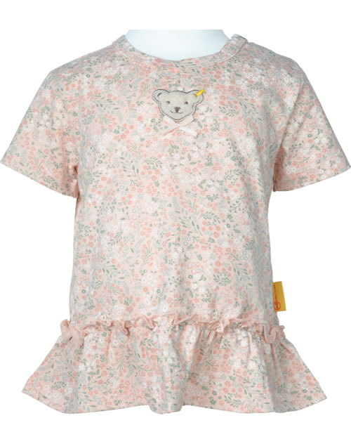 Kurzarmshirt für Mädchen aus der Jungle Feeling-Kollektion von STEIFF. Das geblümte T-Shirt ist aus weichem Jersey. Schöne Details sind das abgesetzte Röckchen und der STEIFF Bär, den eine Schleife ziert. Druckknöpfe auf der Schulter erleichtern das An- und Ausziehen.