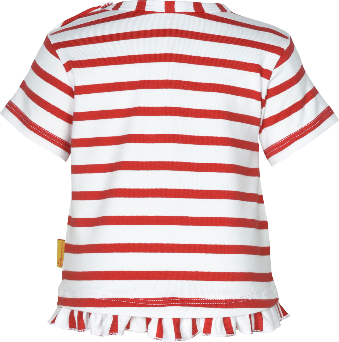 Gestreiftes Kurzarmshirt für Mädchen aus der Marine Air Kollektion von STEIFF. Auf der Vorderseite befindet sich der STEIFF Bär und Rüschen verzieren den Saum. Drucknöpfe auf der Schulter erleichtern das An- und Ausziehen.