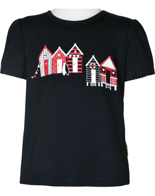 Kurzarmshirt für Mädchen aus der Marine Air Kollektion von STEIFF. Der STEIFF Bär befindet sich auf der Rückseite und die Vorderseite ist mit Badehäusern bedruckt. Schöne Details sind auch gerafften Ärmel und der Saum mit Mäusezähnchen an Ärmeln und Kragen.