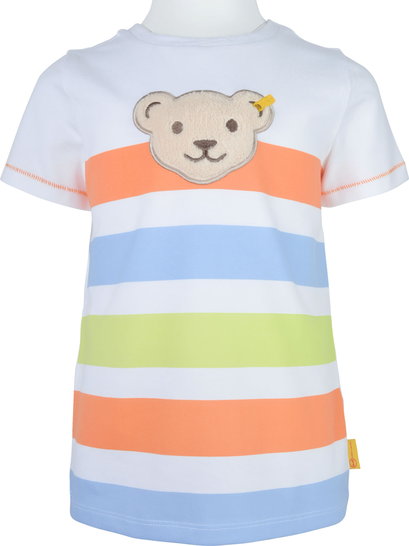 Gestreiftes Kurzarm-Shirt für Jungen aus der Dinomite-Kollektion von STEIFF. Der STEIFF Bär auf der Brust ist mit Quietsche. Das weiche Material sorgt für einen hohen Tragekomfort.