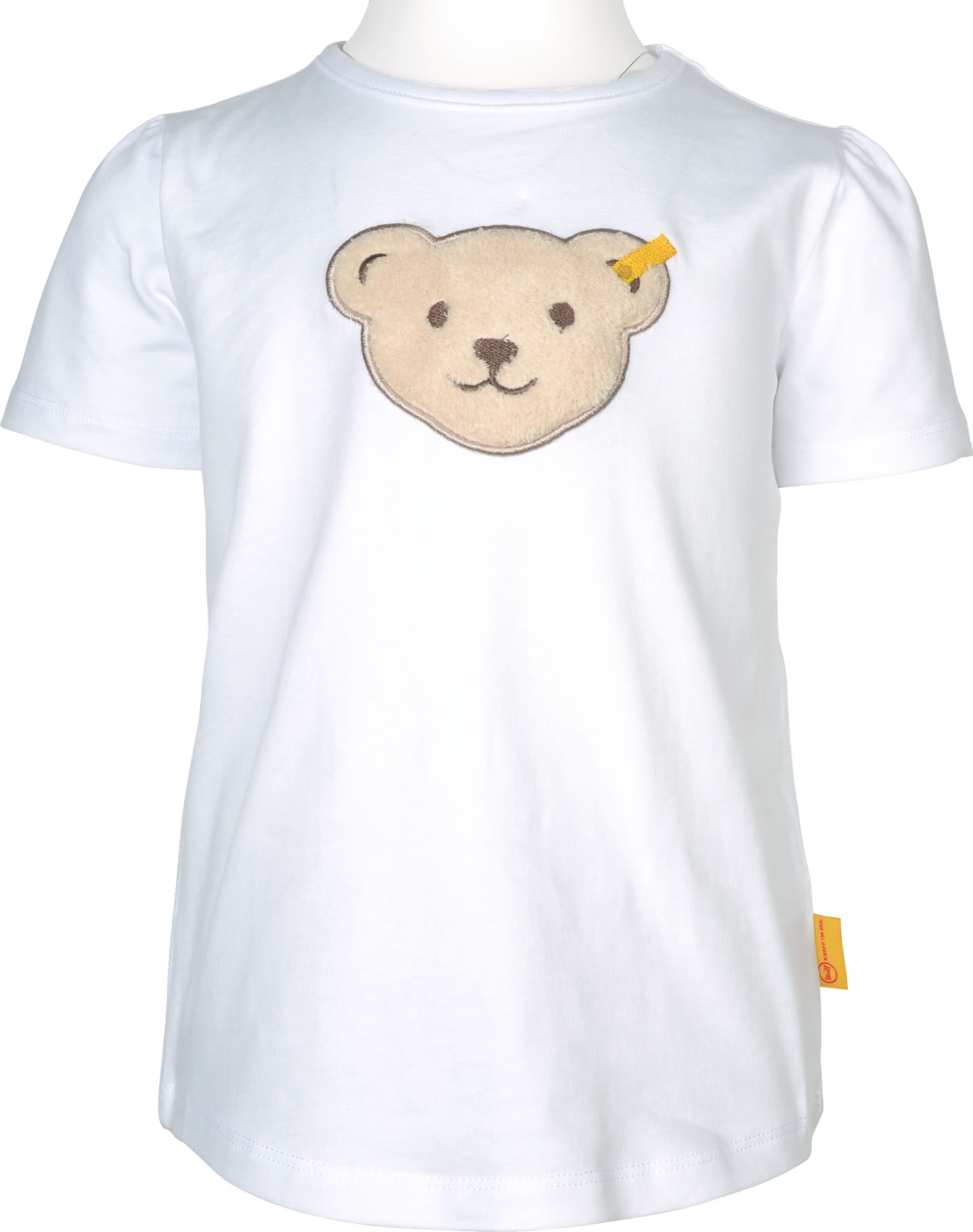 Kurzarm-Shirt für Mädchen aus der Garden Party-Kollektion von STEIFF. Der STEIFF Bär auf der Brust ist mit Quietsche. Schöne Details sind die Raffungen an den Ärmeln. Das weiche Material sorgt für einen hohen Tragekomfort.