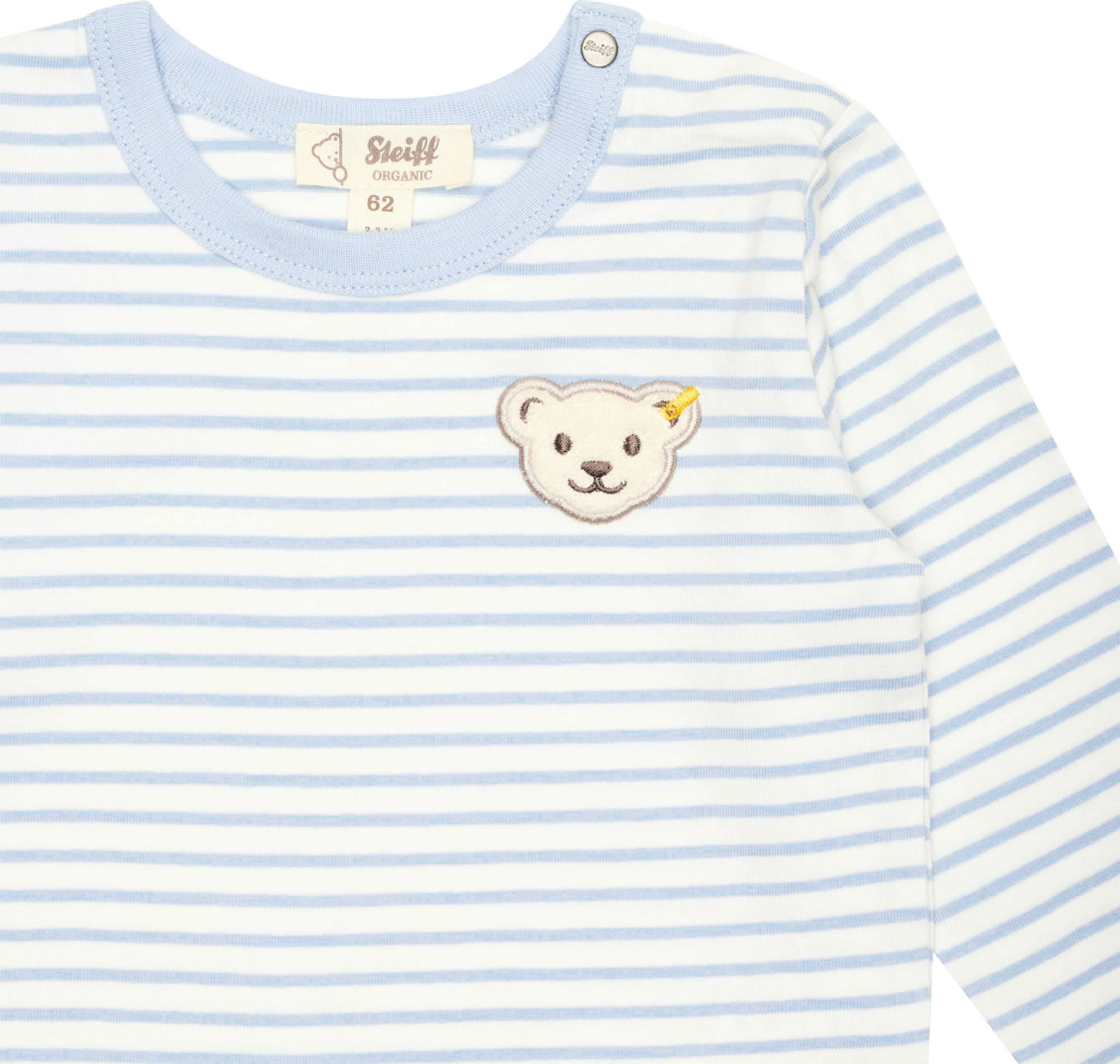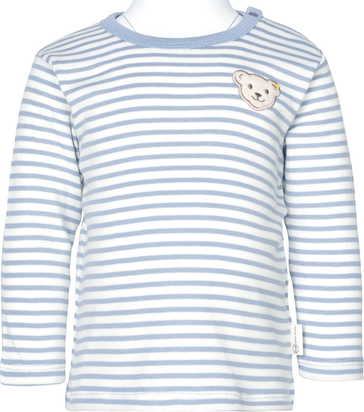 Gestreiftes Langarm-Shirt mit Rundhals-Ausschnitt aus der Baby Wellness-Kollektion von STEIFF. Der kleine STEIFF Bär ziert die Brust. Das weiche Material aus ökologisch hergestellter Baumwolle sorgt für einen hohen Tragekomfort. Dank der zwei Druckknöpfe am Halsausschnitt wird das An- und Ausziehen zum Kinderspiel.