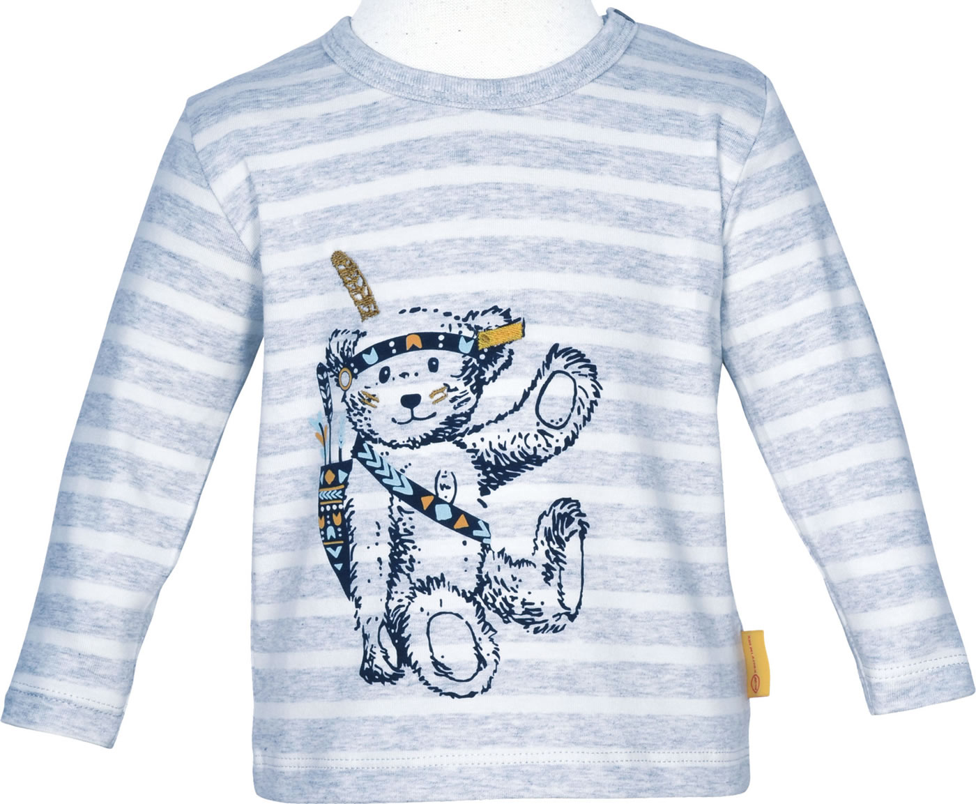 Gestreiftes Langarm-Shirt mit Rundhals-Ausschnitt für Jungen aus der Indi Bear-Kollektion von STEIFF. Der Indianer-STEIFF Bär auf der Brust zieht alle Blicke auf sich. Das weiche Material sorgt für einen hohen Tragekomfort. Dank der zwei Knöpfe am Halsausschnitt wird das An- und Ausziehen zum Kinderspiel.