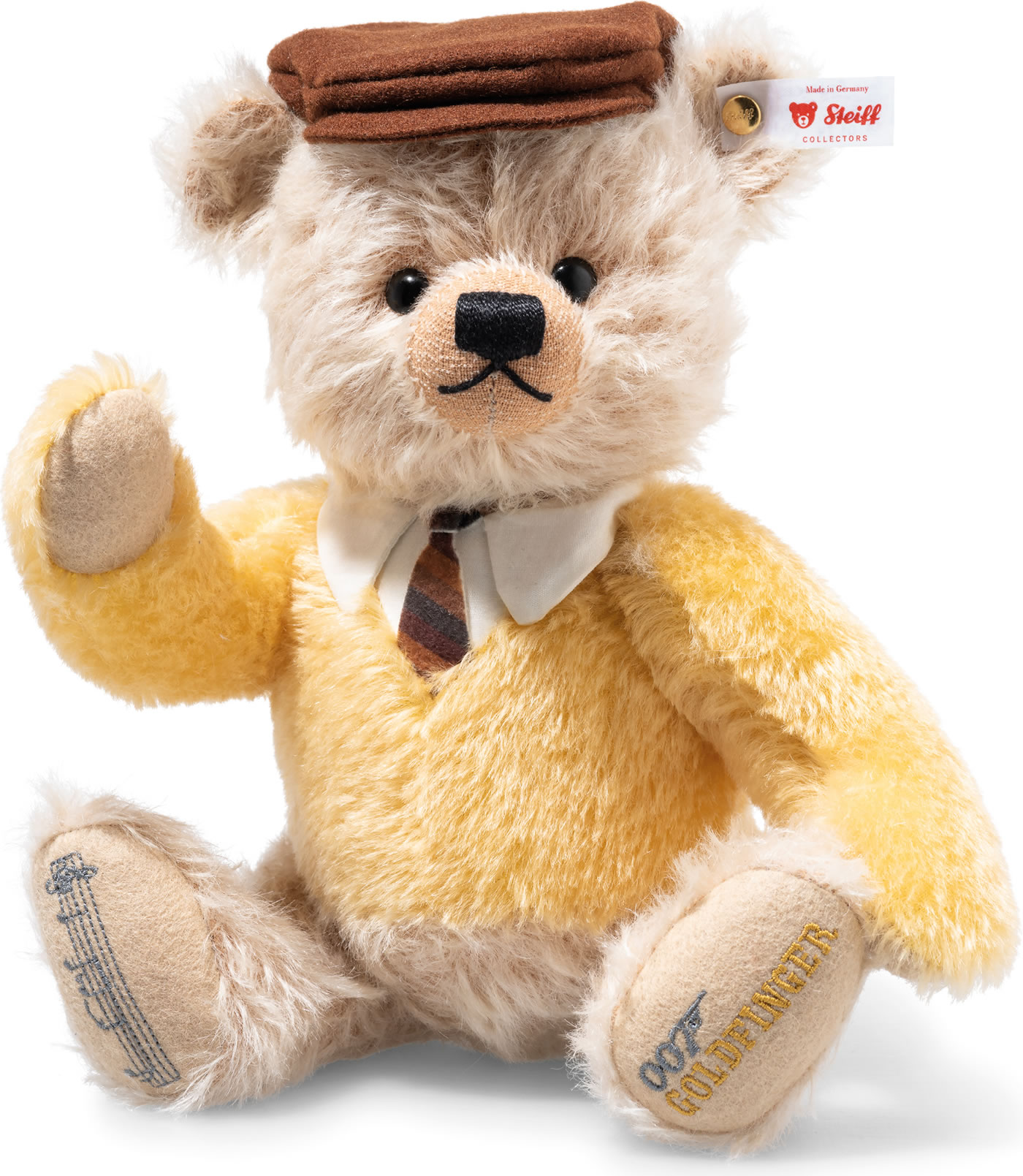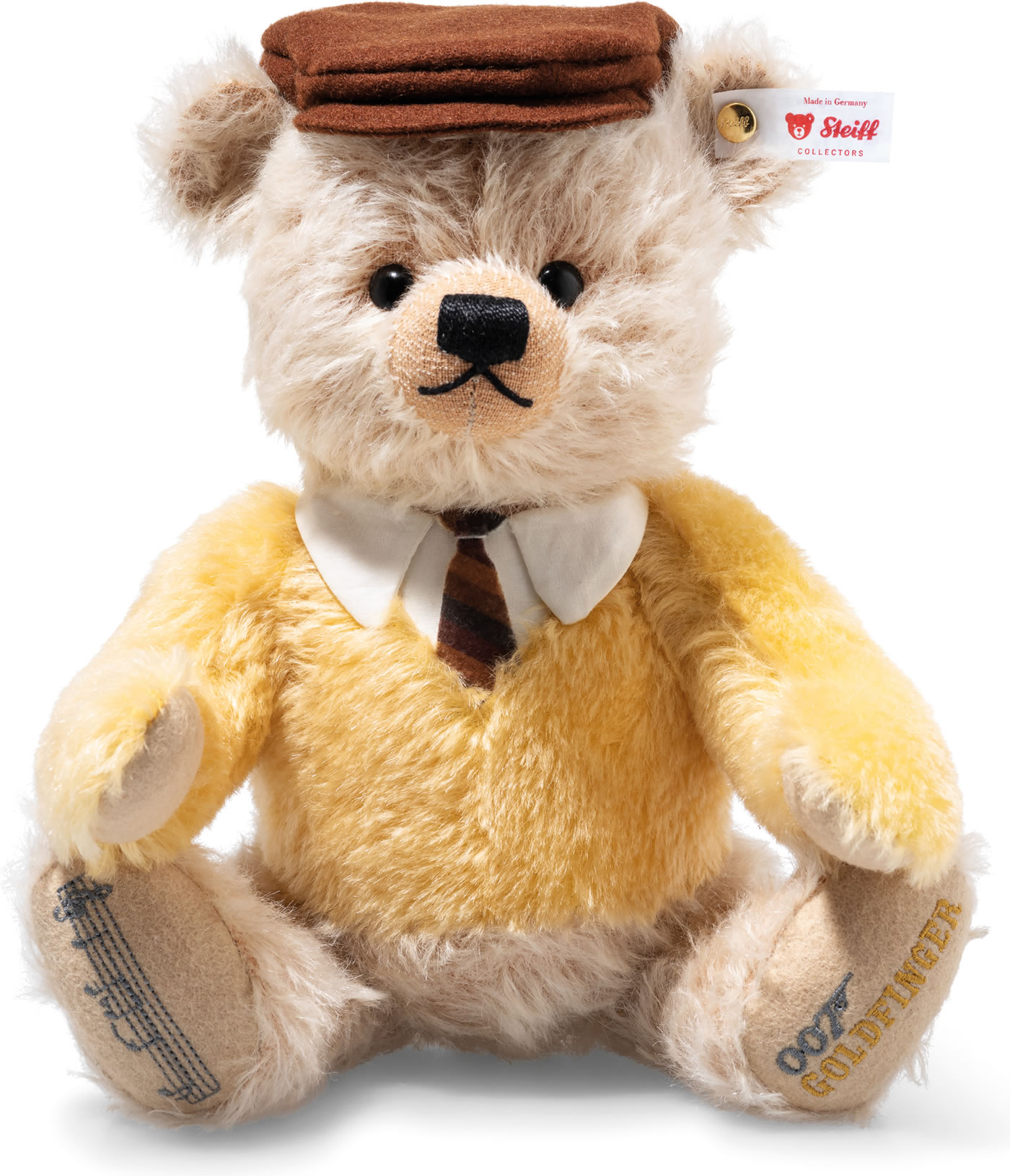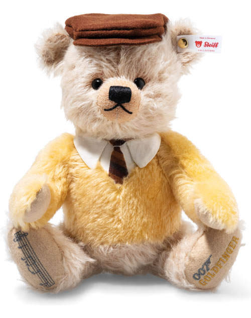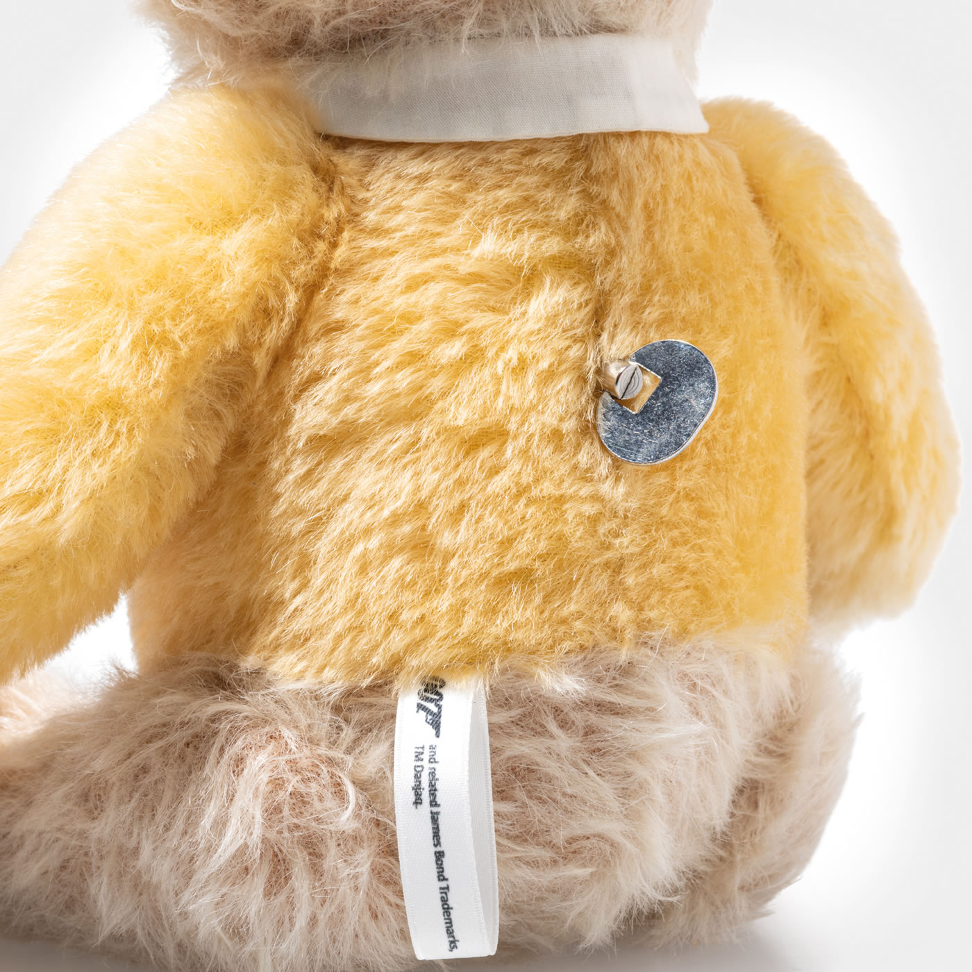 1964 wurde aus Ian Flemings Roman Goldfinger der dritte Film im James Bond Universum. Goldfinger hat viele ikonische 007-Highlights. Diesen hier nennen viele den großartigsten James Bond-Moment überhaupt: „Auf Wiedersehen, Mr. Bond“ „Erwarten Sie, dass ich rede?“ „Nein, Mr. Bond, ich erwarte, dass Sie sterben!" Auric Goldfinger, der unheimlichste aller James Bond Bösewichte, hat eine Faszination für Gold, die er Bond während einer Partie Golf offenbart. Bond trickst Goldfinger so aus, dass dieser verliert. Diese Szene ist die Inspiration für das Design dieses Teddybären. Er trägt das Outfit, das der deutsche Schauspieler Gert Fröbe im Film trug. Das Logo des Films ist auf einer Sohle eingestickt. Auf der anderen befinden sich die Musiknoten der Titelmelodie des Films. Mithilfe eines Musikwerkes im Inneren des kleinen Bösewichts, spielt diese den preisgekrönten Soundtrack.