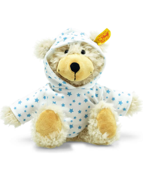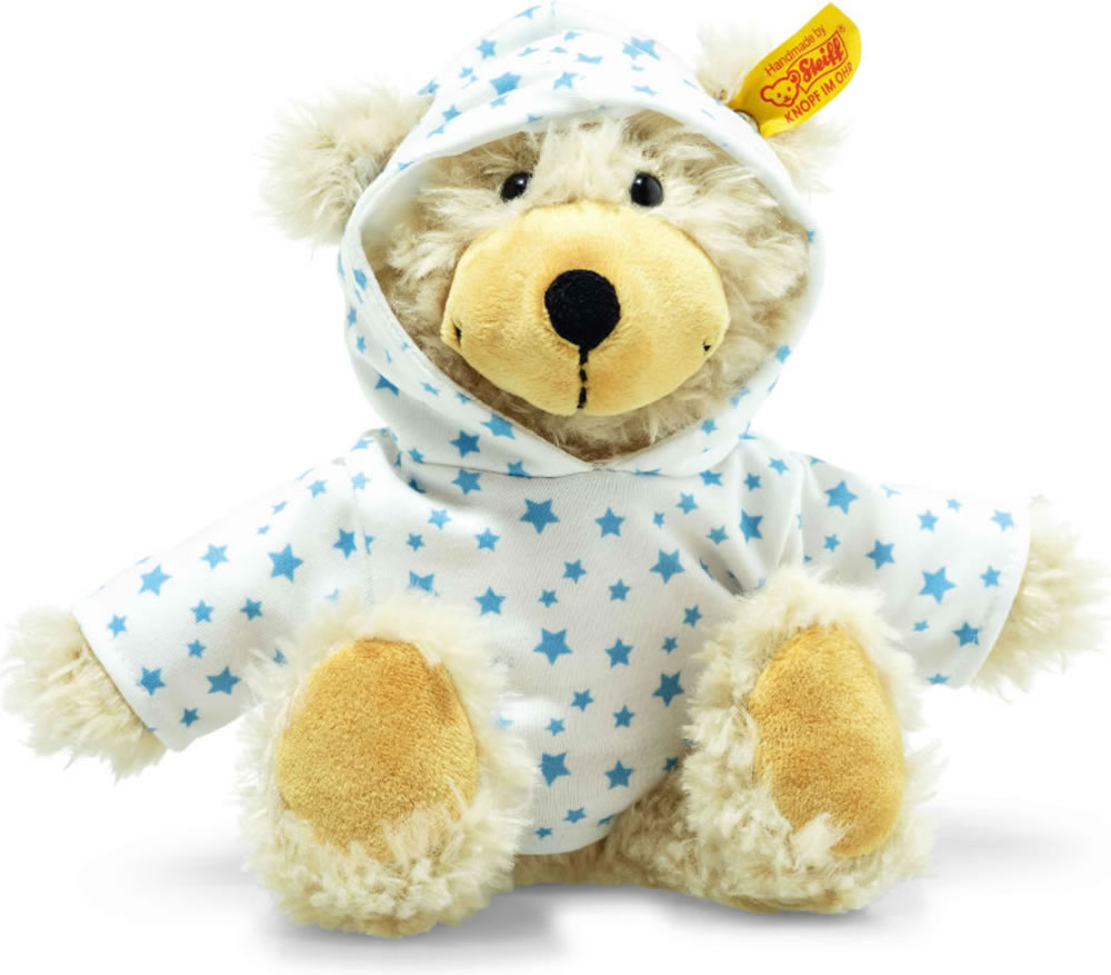 Der 23 cm große Charly Stars Schlenker-Teddybär mit Kapuzenpullover ist für alles zu haben. In der Kapuze sind Öffnungen, um die Teddybärenohren durchzustecken. Sein beigefarbenes Fell ist gelockt und seine schwarze lustige Nase sitzt in dem fröhlichen Gesicht, das in Caramel gehalten ist. Sitzen kann der süße Charly gut dank der eingearbeiteten Granulatsäckchen. Der Kapuzenpullover ist ausziehbar. Der cremefarbene Pullover ist über und über mit blauen Sternen bedruckt. Es gibt Charly auch ohne Kapuzenpullover.
