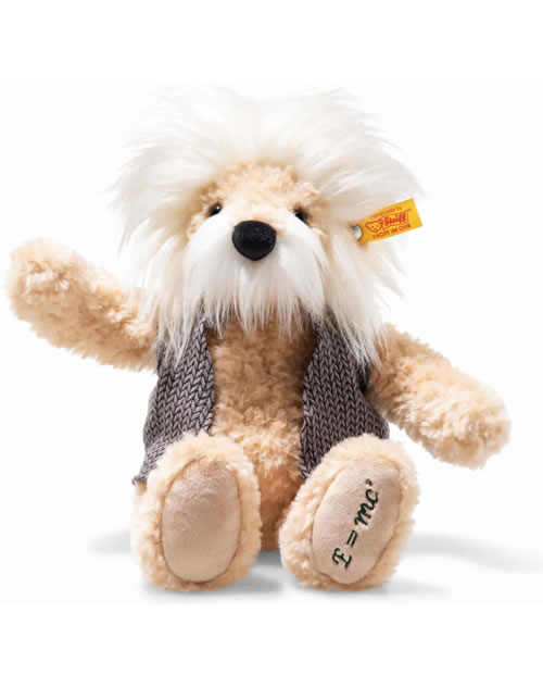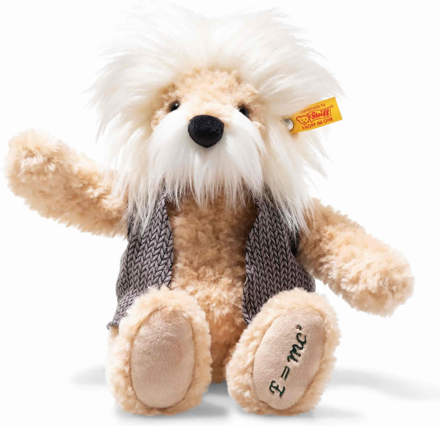 Das Genie unter den Teddybären gibt sich die Ehre. Pünktlich zu seinem 140. Geburtstag wird der große Physiker Einstein mit diesem Teddybären geehrt. Er ist aus kuschelweichem Plüsch in warmem Beige gefertigt. Der Bart und der Haarschopf sind in auffälligem Weiss gehalten. Er ist 28 cm groß und trägt eine abnehmbare braune Weste in Strickoptik. Auf der linken Fußsohle ist Einsteins berühmte Formel in schwarzem Garn gut lesbar eingestickt.