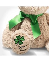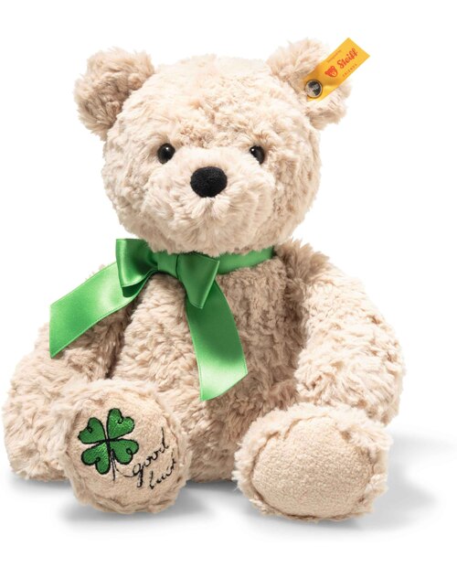 Dieser kuschelige Plüschfreund gliedert sich als ganz besonderer Glücksbringer in die Jimmy-Reihe ein. Jimmy Teddybär zeigt den Schriftzug „Good Luck“ sowie ein vierblättriges Kleeblatt auf seiner Sohle und trägt ein zuversichtliches Lächeln auf seinem schwarz gestickten Mund. Eine grüne Schleife um den Hals schmückt das hellbraune, wunderbar weiche Fell des 30 cm großen Bären. Nicht nur in den Armen gehalten, zeigt er sich als guter Freund. Dank der Granulatsäckchen in Gesäß, Pfoten und Sohlen kann er auch ausgezeichnet sitzen. Jimmy ist ein verlässlicher Begleiter, der immer da ist, wenn man ihn braucht.