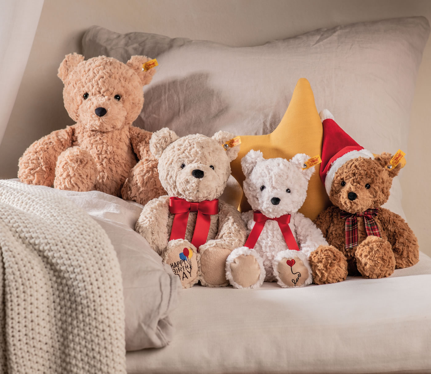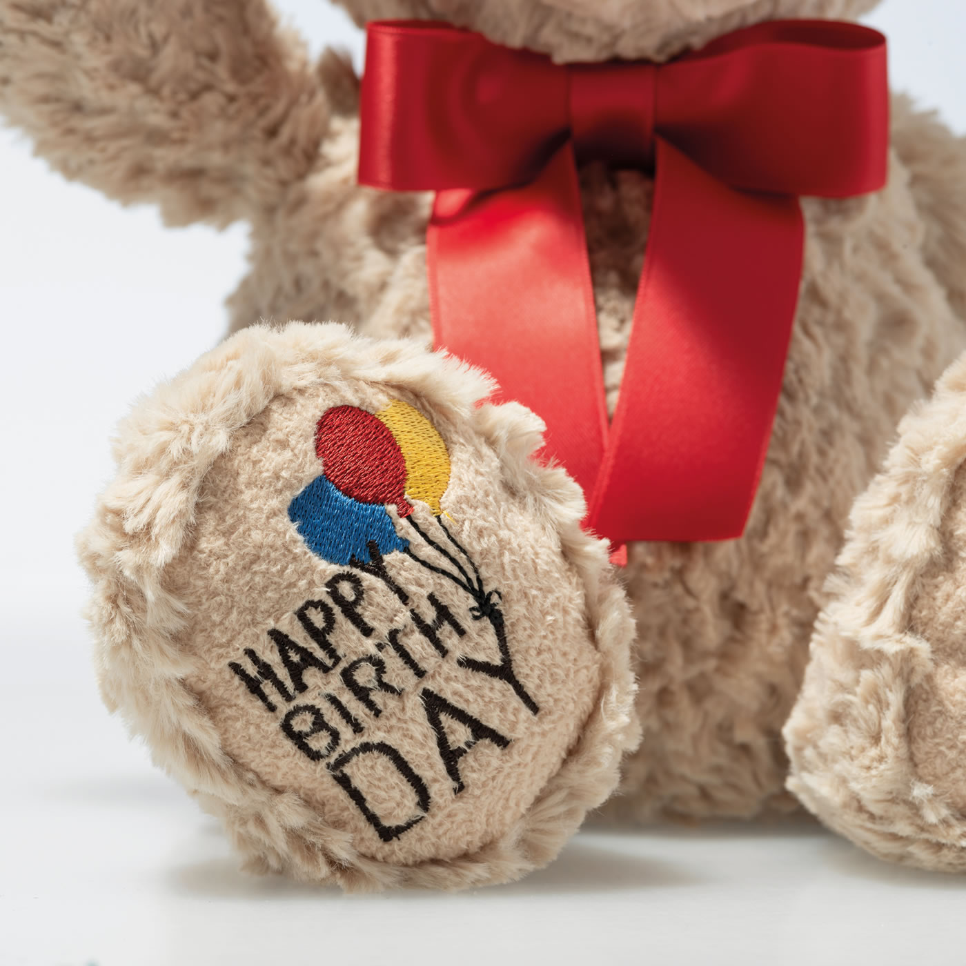 Der 35 cm große Teddybär Jimmy Birthday aus unserer Soft Cuddly Friends Serie ist das perfekte Geschenk an jeden, den man besonders in sein Herz geschlossen hat! Er schaut neugierig aus den schwarzen Augen, die feste Schnuppernase und seine knuffigen Ohren mit Edelstahl „Knopf im Ohr“ passen bestens dazu. Jimmy ist rundum mit herrlich wildem Kuschelplüsch bezogen und hat Granulatsäckchen in Po und Pfoten, was nicht nur Stabilität beim Sitzen verleiht, sondern auch für kleine und große Hände ein faszinierendes Fühl-Erlebnis ist! Um den Hals trägt er eine rote Schleife und die rechte Fußsohle ist liebevoll mit der Happy Birthday- Botschaft bestickt.