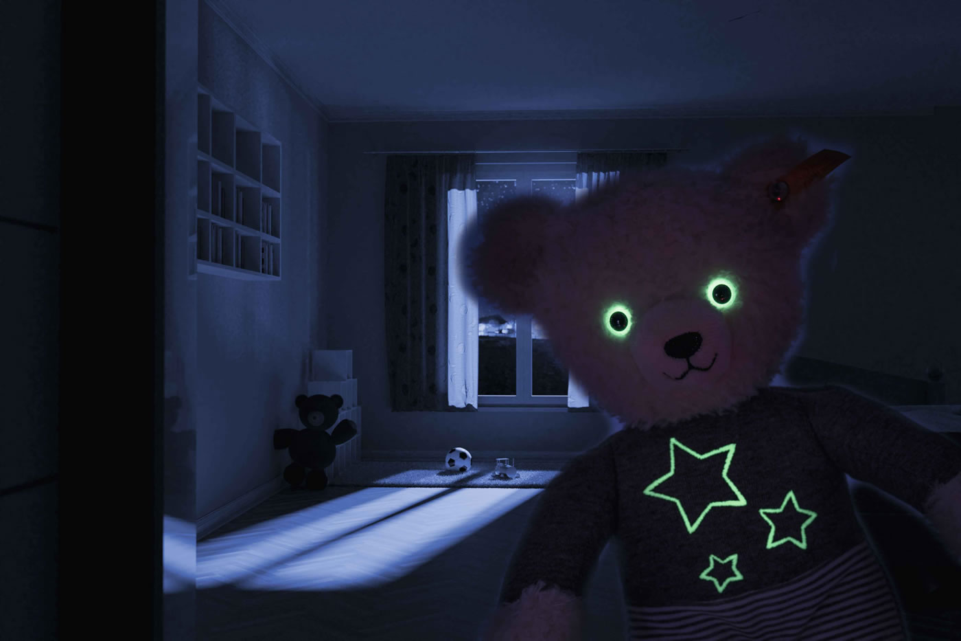 Ein vertrauter Freund für Tag und Nacht ist der 30 cm große Light at Night Knuffi Teddybär. Kleine Hände können sich am strubbelig weichen Plüsch und der kurz geschorenen Schnauze kaum sattfühlen. Wird es dunkel, leuchten seine Augen und die in Leuchtgarn gestickten Sterne auf seinem grau-weißen Schlafanzug bis zu 20 Minuten lang sanft. Der Glow-in-the-Dark-Effekt beruhigt, die Dunkelheit wird vertraut, das Einschlafritual für alle leichter. Bis es irgendwann heißt. „Licht aus! Knuffi soll leuchten…“