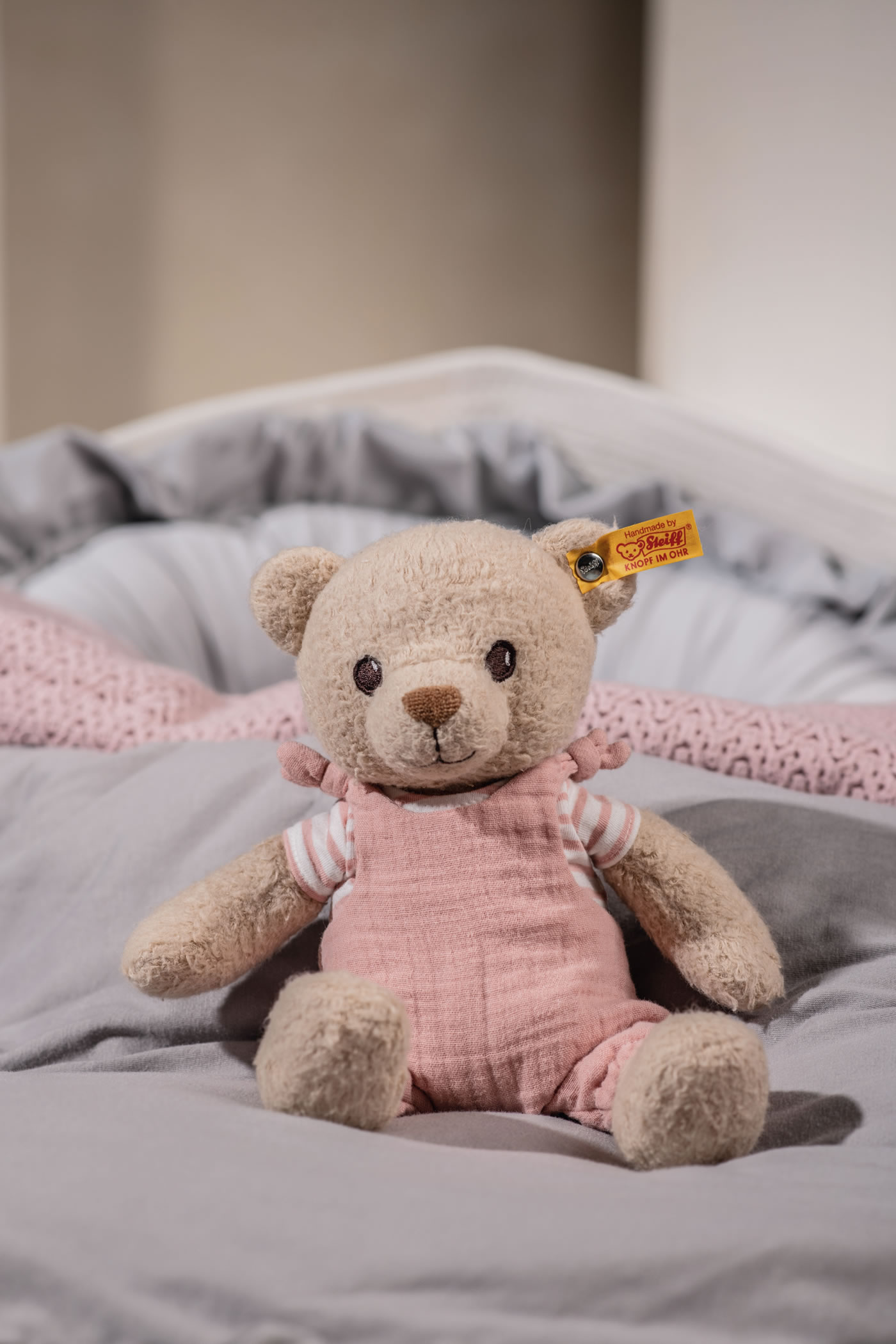 Natürlich, kuschelig & umweltbewusst: Der flauschige Teddybär Nele von Steiff ist aus 100 % GOTS-zertifizierter Bio-Baumwolle gefertigt und mit einer nachhaltigen Füllung aus Bio-Baumwolle und recycelten PET-Flaschen versehen – ideal für die Kleinsten.