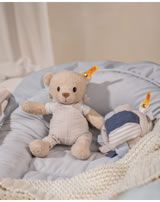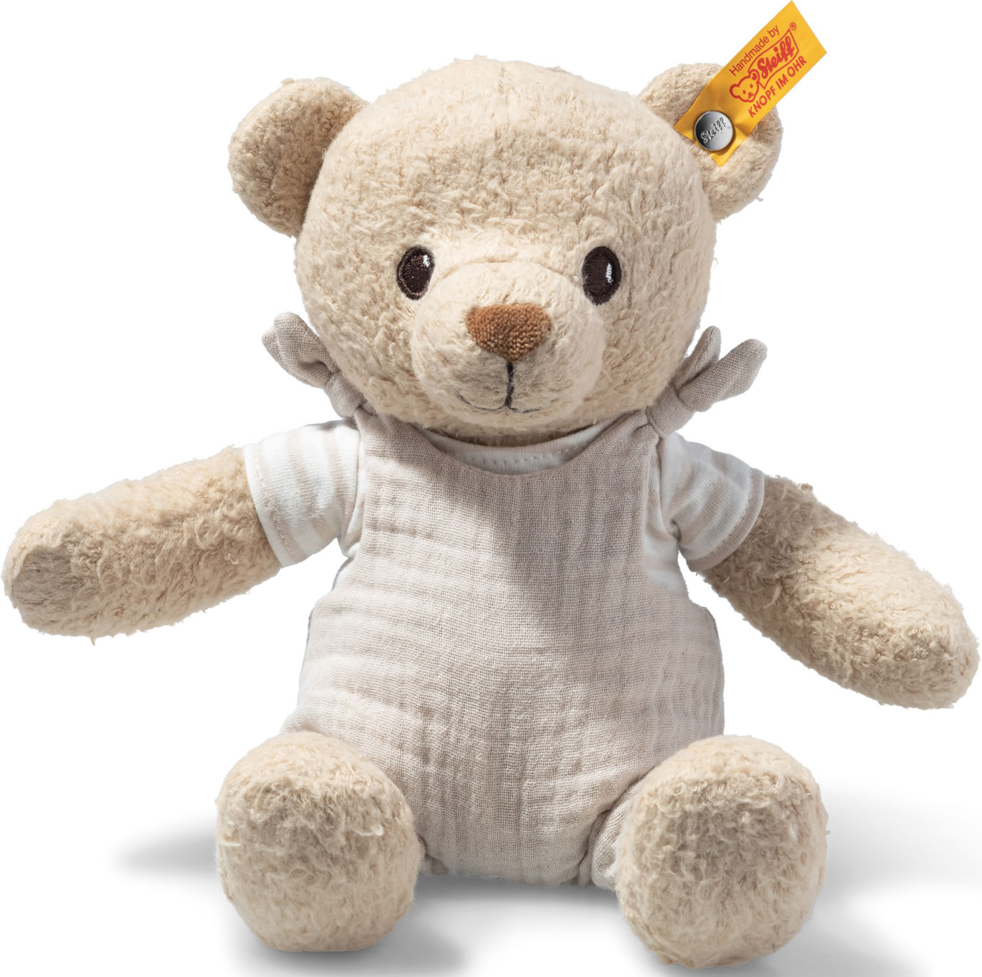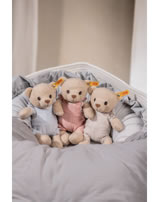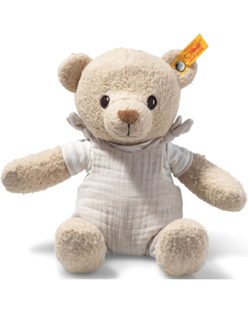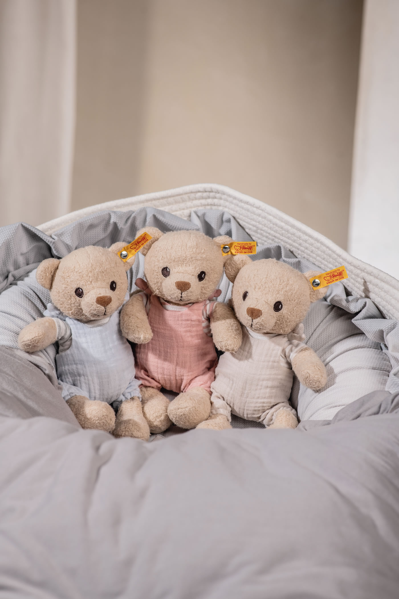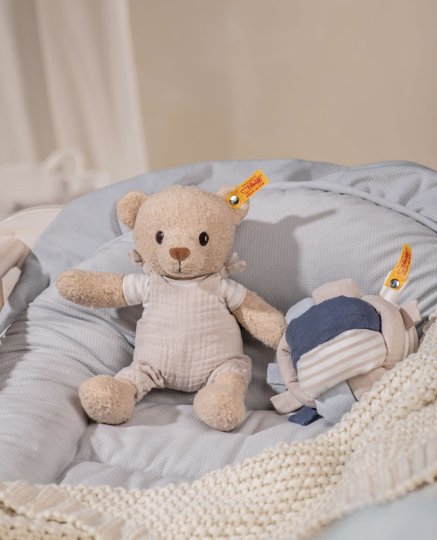 Hier kommt der knuffige Steiff GOTS Teddybär Noah in Beige. Er ist umweltbewusst mit Bio-Baumwolle und recycelten PET-Flaschen befüllt. Seine Kleidung ist an die vertraute Struktur von Mullwindeln angelehnt und auch der Plüsch ist aus flauschiger, zertifizierter 100% Bio-Baumwolle (GOTS). Mit den gestickten Augen schaut er neugierig in die Welt. Die 26 cm großen Freunde Noah, Niko und Nele sind schmuseweich und ideal als Geburts-,Tauf-oder Geburtstagsgeschenk.