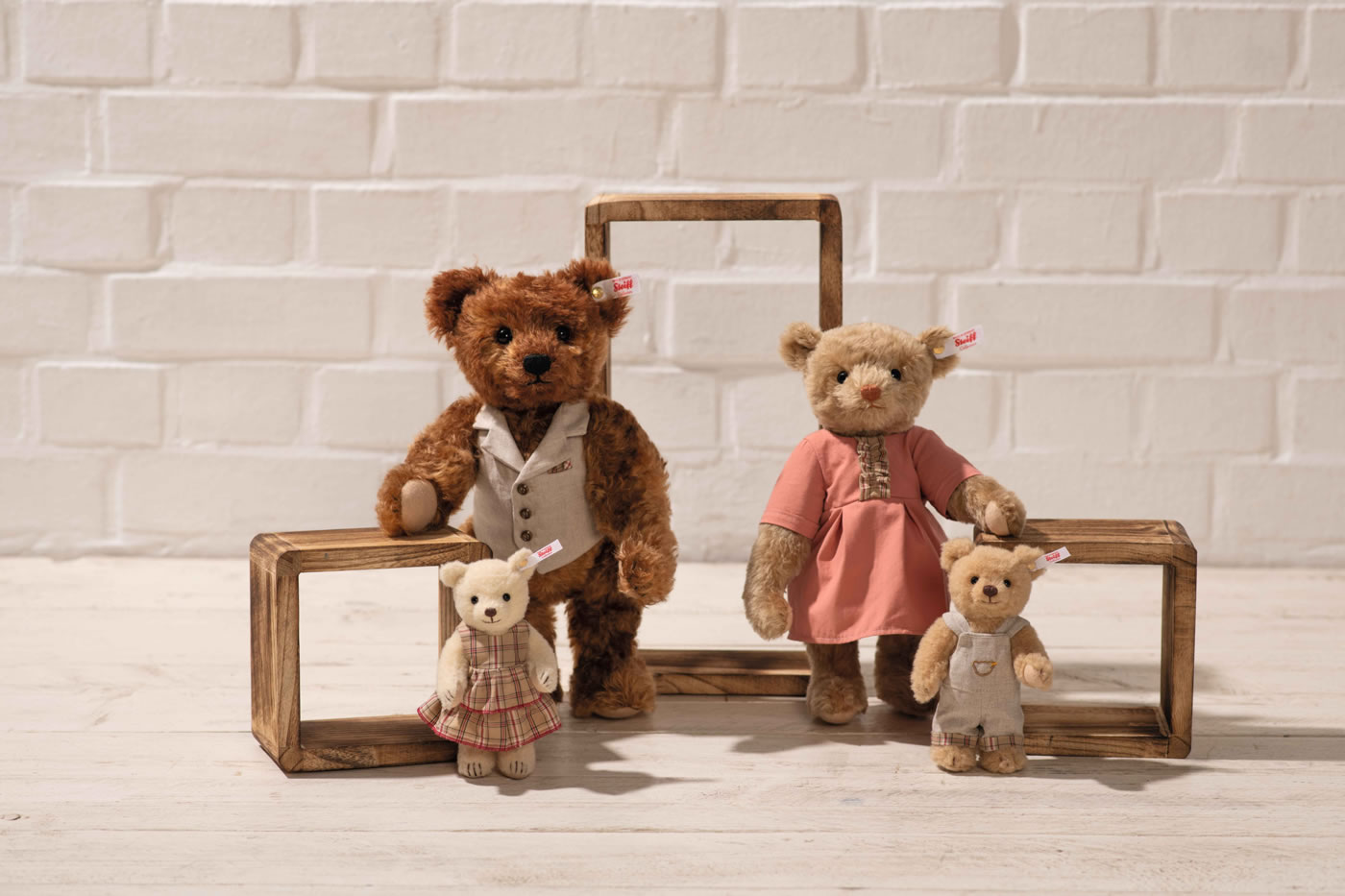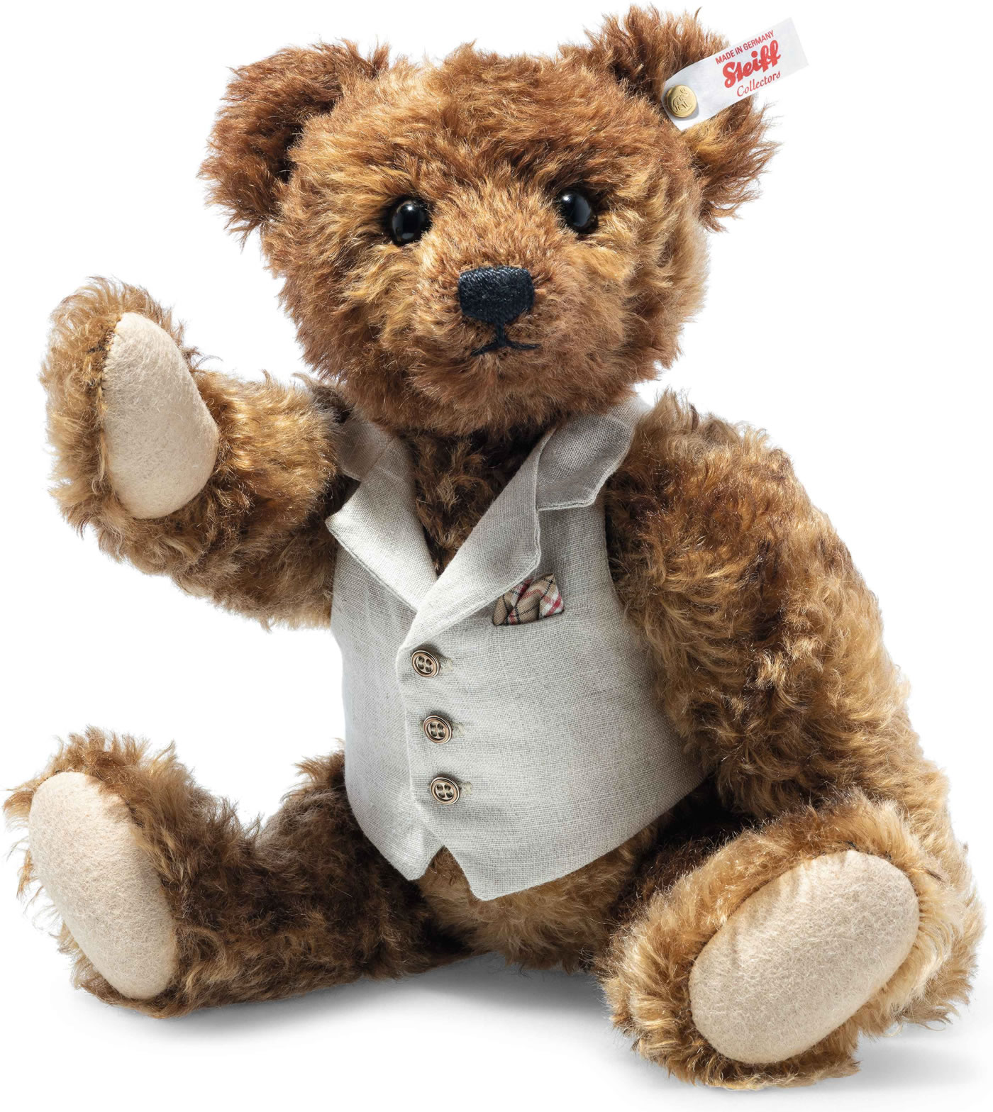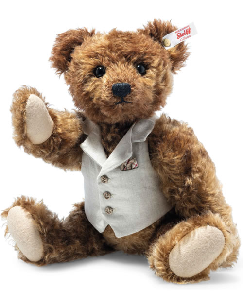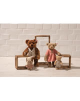 1902 erfand Steiff den Teddybären. Anlässlich des Jubiläums des Teddybären freut sich Steiff, die Steiff Teddybären-Familie vorzustellen. Papa Bär, das Oberhaupt der Steiff Familie, bringt Ruhe und Zuversicht in die Wohnung. Er ist aus rotbraunem Mohair gefertigt, das im Batikverfahren aufgetragen wird. So wird jeder Papa Bär zu einem Unikat. Diese Batiktechnik verleiht dem ohnehin schon beeindruckenden Teddybären zusätzliche Tiefe und Charakter. Bekleidet mit einer eleganten Leinenweste mit Taschendesign, die perfekt mit all seinen Familienmitgliedern harmoniert.
