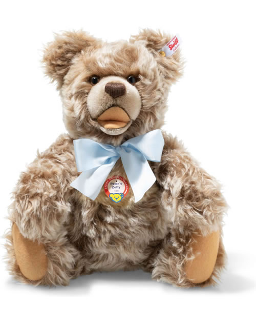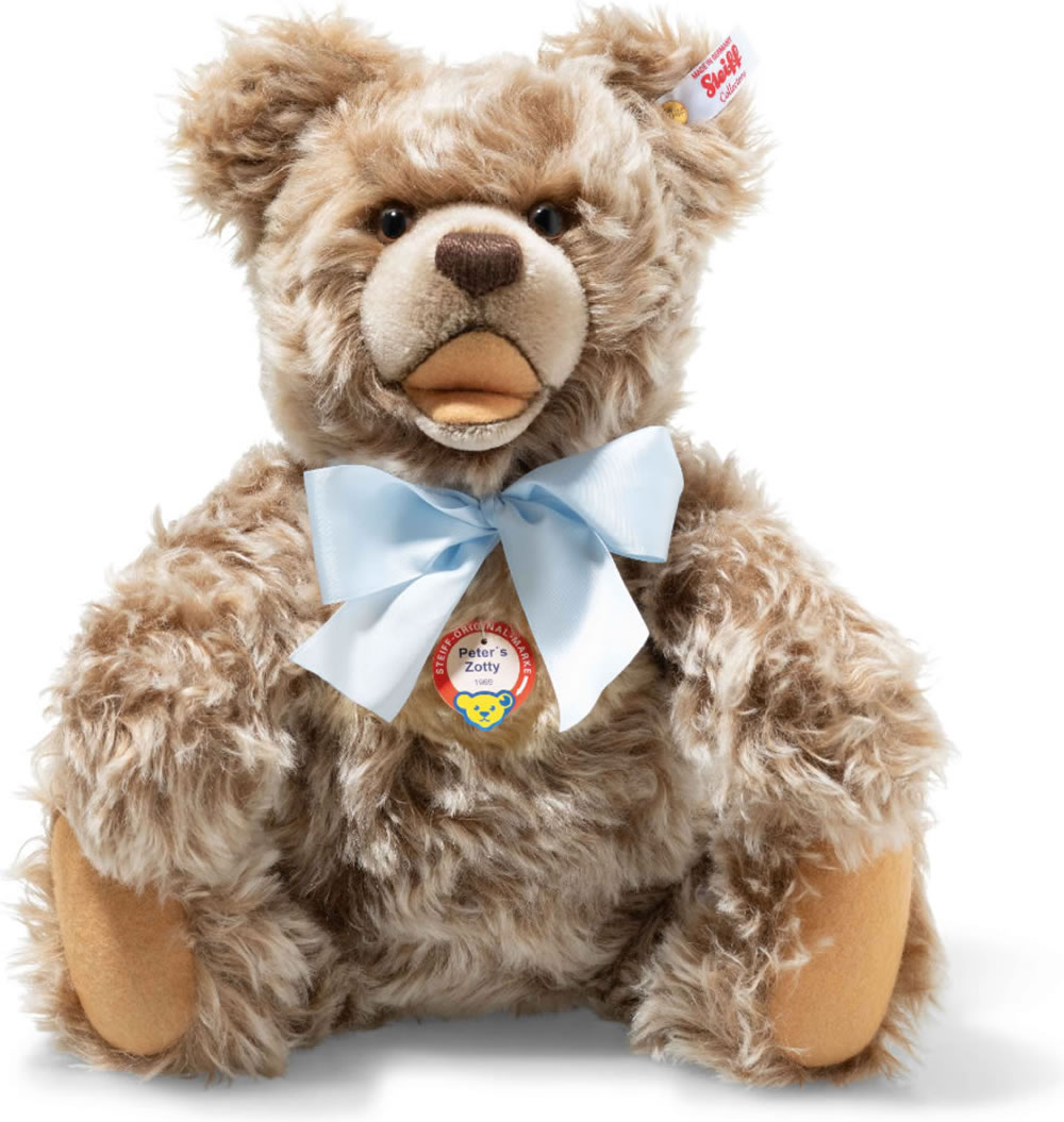 Der Zotty – ein Klassiker ab 1951 - hat unzählige Kinderherzen für sich gewonnen. Auch das von Peter Hotz, der als Ur-Ur-Großneffe Margarete Steiffs im Alter von drei Jahren für den Steiff Katalog Modell stand. Passend zu seinem Geburtsjahr 1969 ist Peters Zotty limitiert auf 969 Exemplare in feinstem Mohair: Sein fröhlicher Charme, die Brummstimme und die Farbe Caramel gespitzt sind genau wie einst. Jedem Exemplar ist der Abzug eines alten Fotos beigelegt, auf dem Peter Hotz mit seinem Liebling abgebildet ist. Der maßgefertigte Rahmen für das Foto erinnert an die grünen Fensterscheiben der Werkshalle von Steiff.