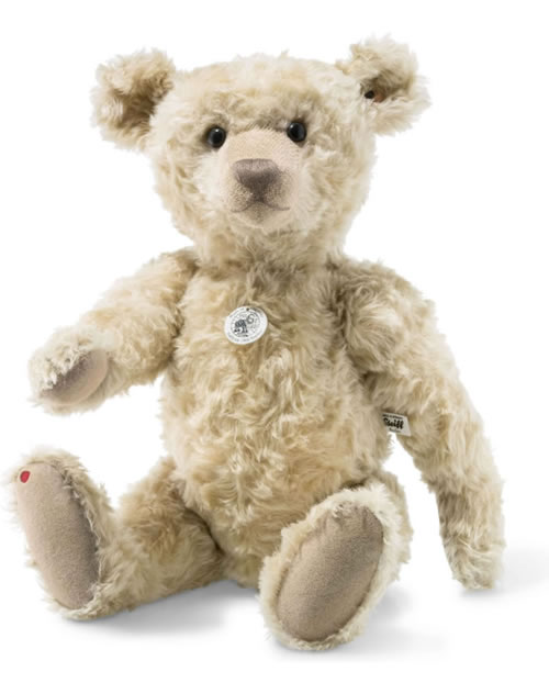 Der Teddybär 1906 Replica blickt zurück auf die ruhmreichen Steiff Bärenjahre. 1906 wird aus dem Bärle von 1905 endgültig der Teddybär, benannt nach dem amerikanischen Präsidenten ‚Teddy‘ Roosevelt. Im Jahr darauf folgt das größte Bärenjahr überhaupt. Die 50 cm große Replik aus feinstem Mohair möchte den Erfolgsbären von damals zeigen, aber auch die lange, seither vergangene Zeit. Überall gibt es daher Alterungsspuren zu entdecken, besonders an den Anscheibungen, an Sohlen und Pfoten. Und so könnte man tatsächlich meinen, der Bär säße schon ewig so da. Allerdings muss er auch so manchen Kilometer zu Fuß gegangen sein.