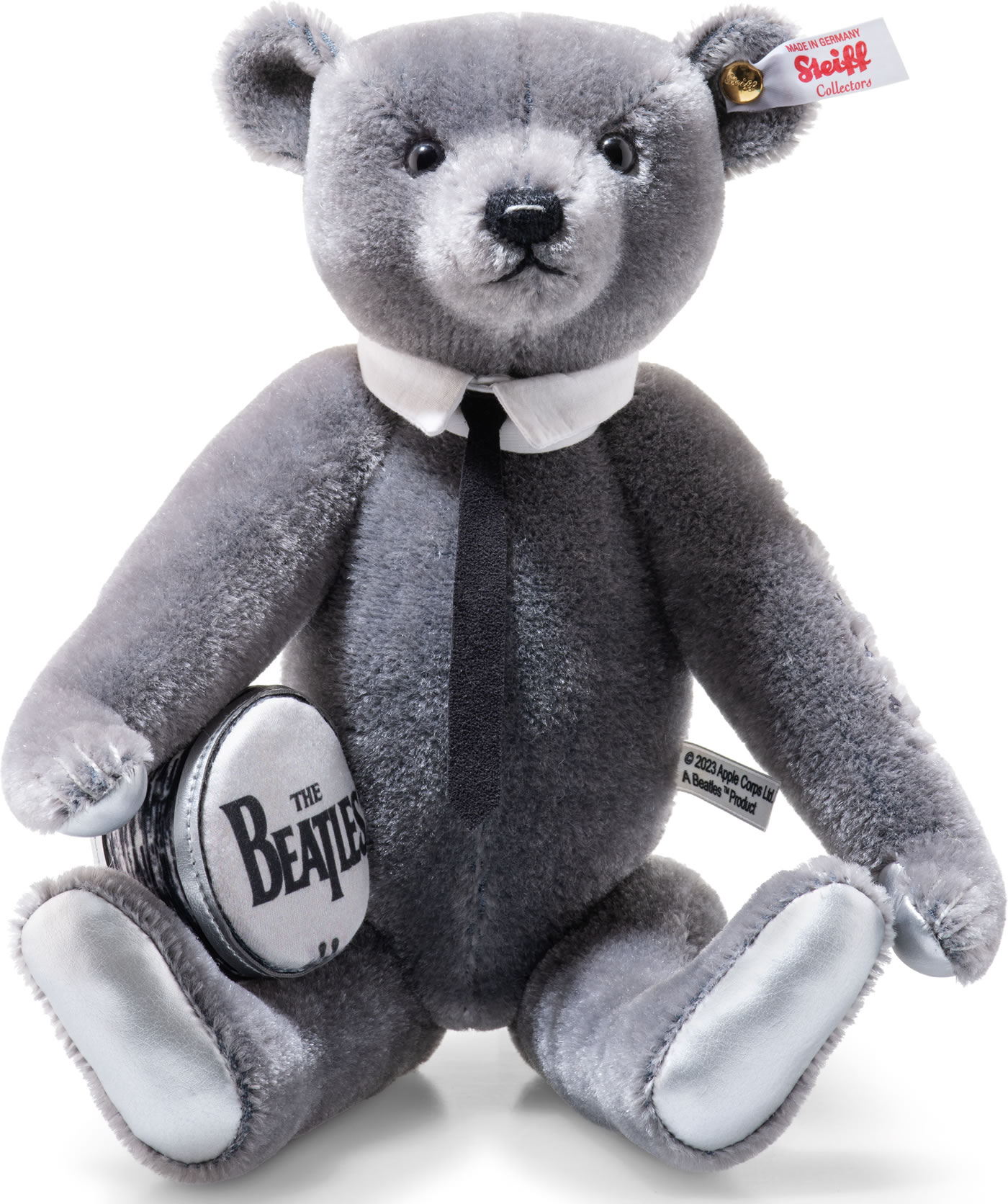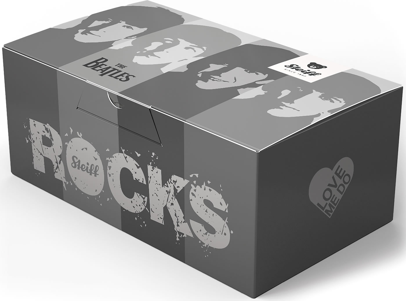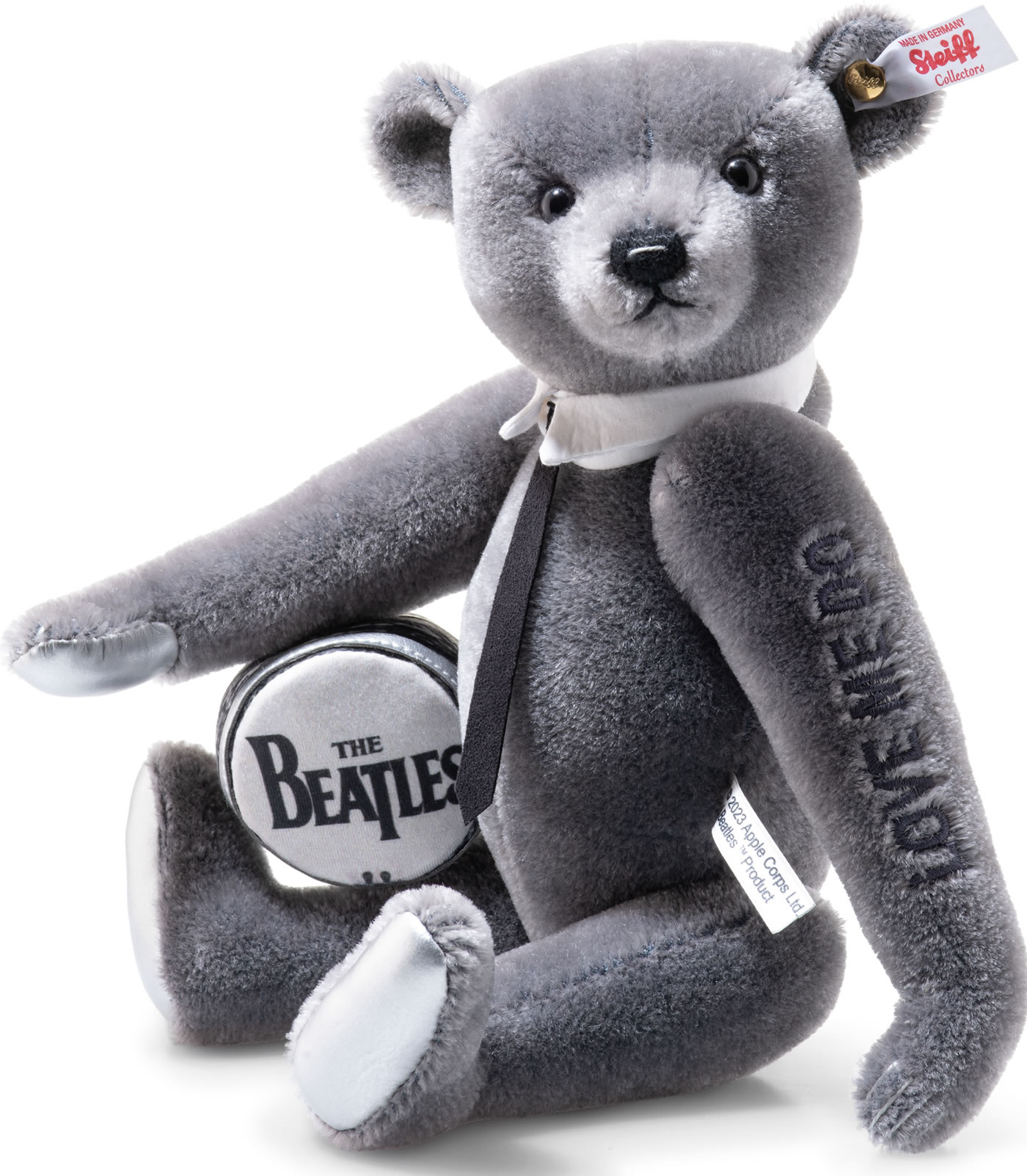 „Love, love me do...“ Auf dem Arm unseres Teddybären ist „Love Me Do“ gestickt. Es war die erste Single, die „The Beatles“ Ende 1962 veröffentlichten. Nach der Veröffentlichung ihres ersten Albums „Please Please Me“ Anfang 1963 wurde ihre Popularität so groß, dass der Begriff „Beatlemania“ geprägt wurde. Diese Ära der einflussreichsten Rockband aller Zeiten wird hier gewürdigt. Der Steiff Beatles Teddybär trägt einen schicken grauen Anzug und das charakteristische Schlagzeug der Beatles unter dem Arm. Steiff Rocks!