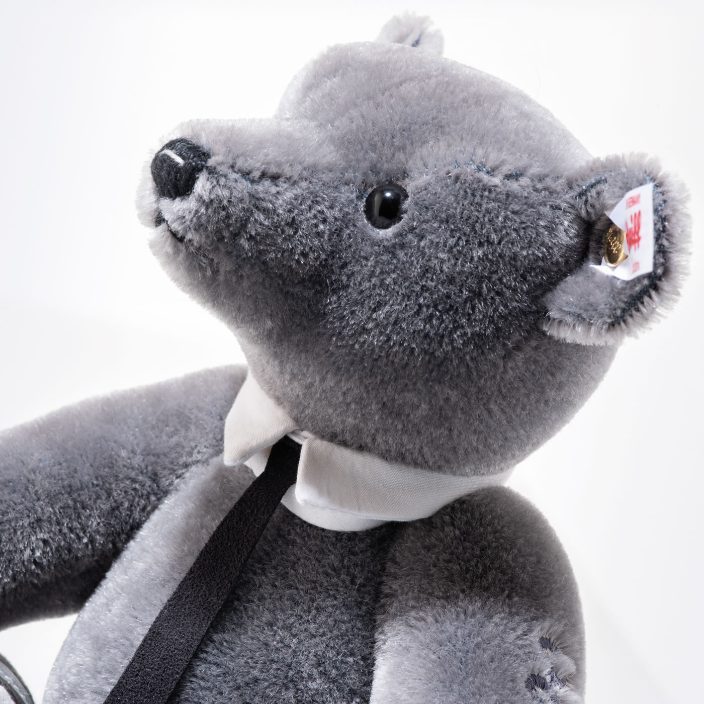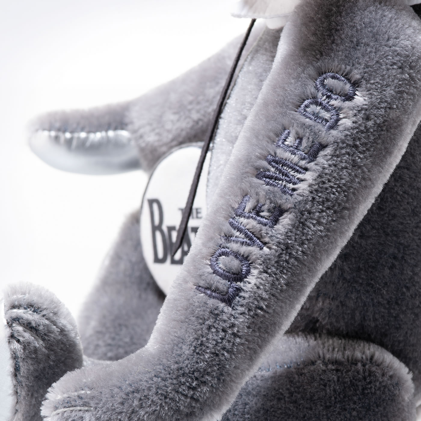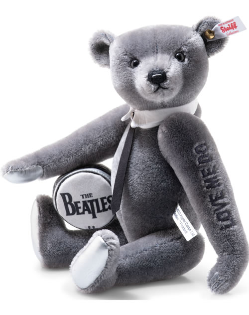 „Love, love me do...“ Auf dem Arm unseres Teddybären ist „Love Me Do“ gestickt. Es war die erste Single, die „The Beatles“ Ende 1962 veröffentlichten. Nach der Veröffentlichung ihres ersten Albums „Please Please Me“ Anfang 1963 wurde ihre Popularität so groß, dass der Begriff „Beatlemania“ geprägt wurde. Diese Ära der einflussreichsten Rockband aller Zeiten wird hier gewürdigt. Der Steiff Beatles Teddybär trägt einen schicken grauen Anzug und das charakteristische Schlagzeug der Beatles unter dem Arm. Steiff Rocks!