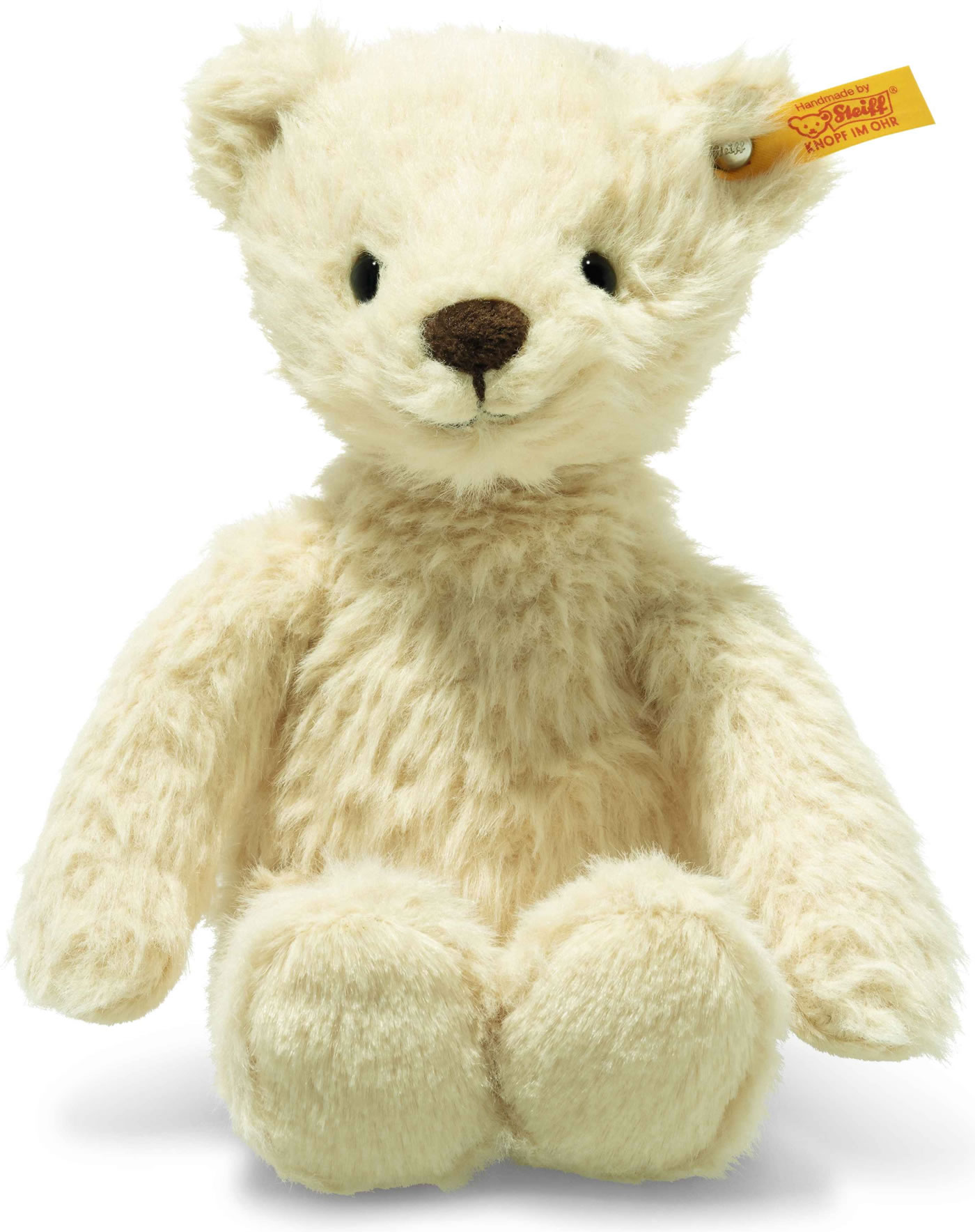 Der 20 cm große Soft Cuddly Friends Thommy Teddybär ist aus kuschelweichem vanillefarbenem Plüsch gefertigt. Sohlen und Pfoten heben sich durch kurzen Plüsch ab. Thommy besitzt einen liebevoll geformten Teddykopf mit leuchtend schwarzen Augen, einer hübschen dunkelbraunen Nase, einem gestickten Mund und knuffigen Bärenohren mit Fahne und Edelstahl „Knopf im Ohr“. Granulatsäckchen in Gesäß, Pfoten und Sohlen sorgen für zusätzlichen Spielspaß und sicheres Sitzen.