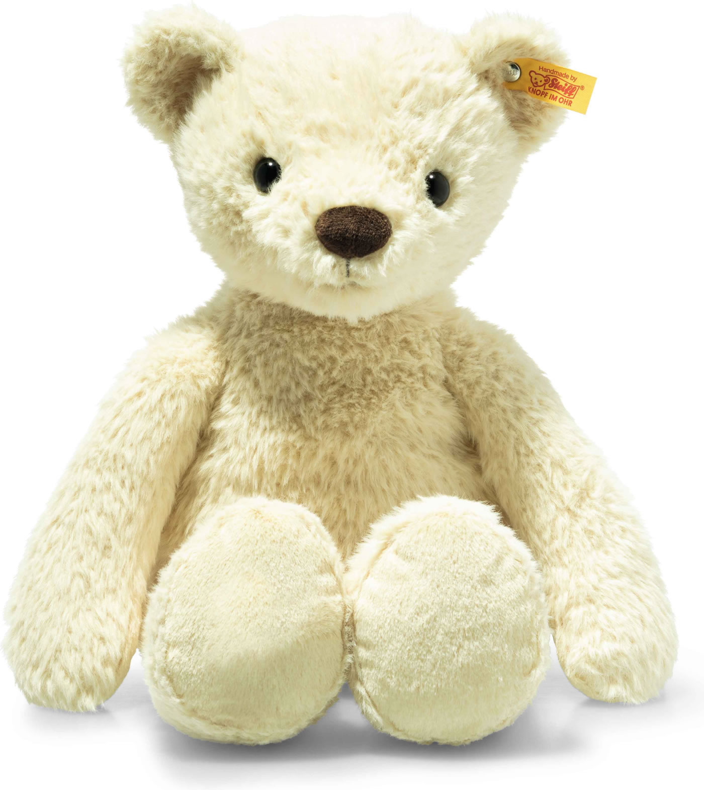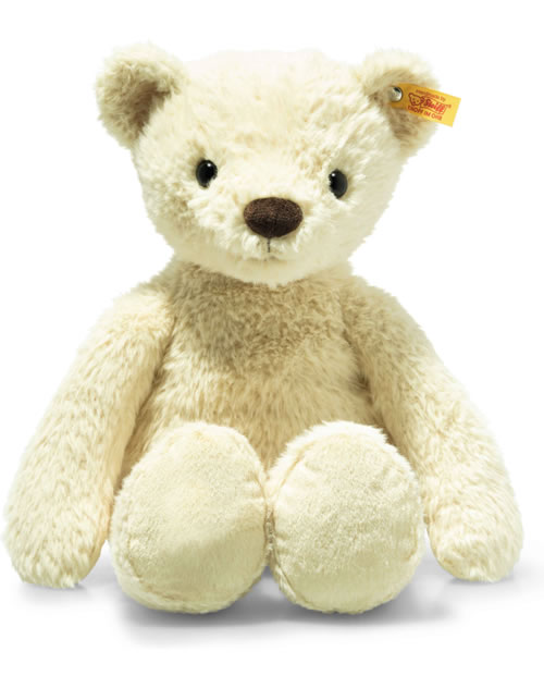 Der 40 cm große Soft Cuddly Friends Thommy Teddybär ist aus kuschelweichem vanillefarbenem Plüsch gefertigt. Sohlen und Pfoten heben sich durch kurzen Plüsch ab. Thommy besitzt einen liebevoll geformten Teddykopf mit leuchtend schwarzen Augen, einer hübschen dunkelbraunen Nase, einem gestickten Mund und knuffigen Bärenohren mit Fahne und Edelstahl-„Knopf im Ohr“. Granulatsäckchen in Gesäß, Pfoten und Sohlen sorgen für zusätzlichen Spielspaß und sicheres Sitzen.