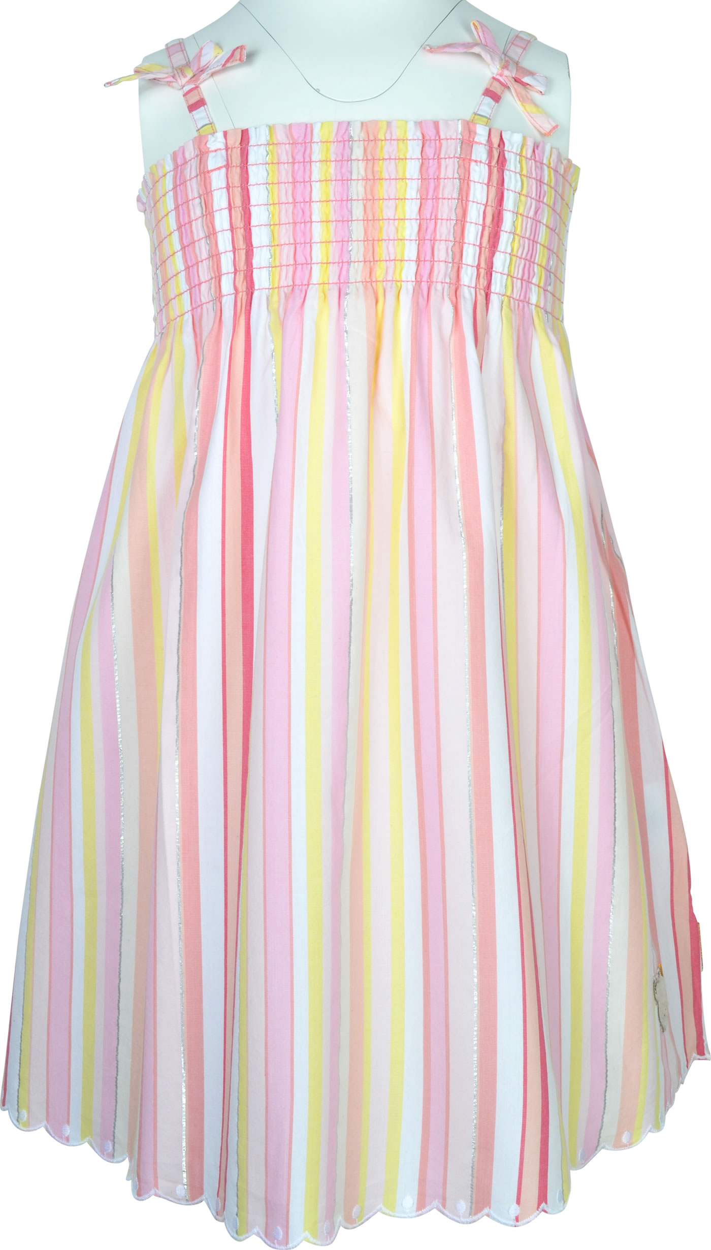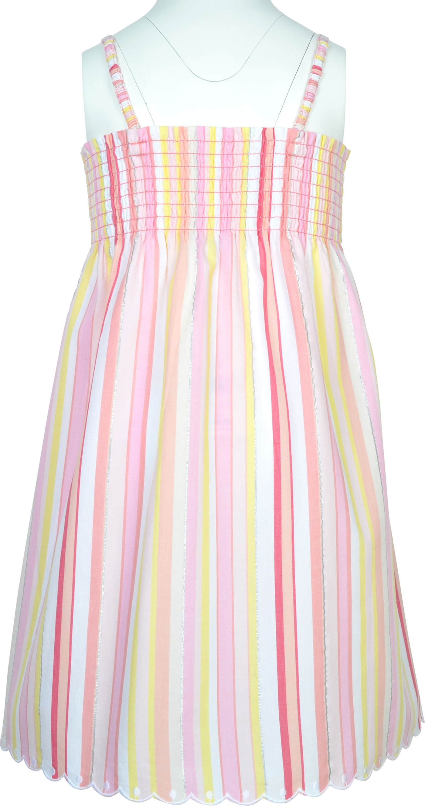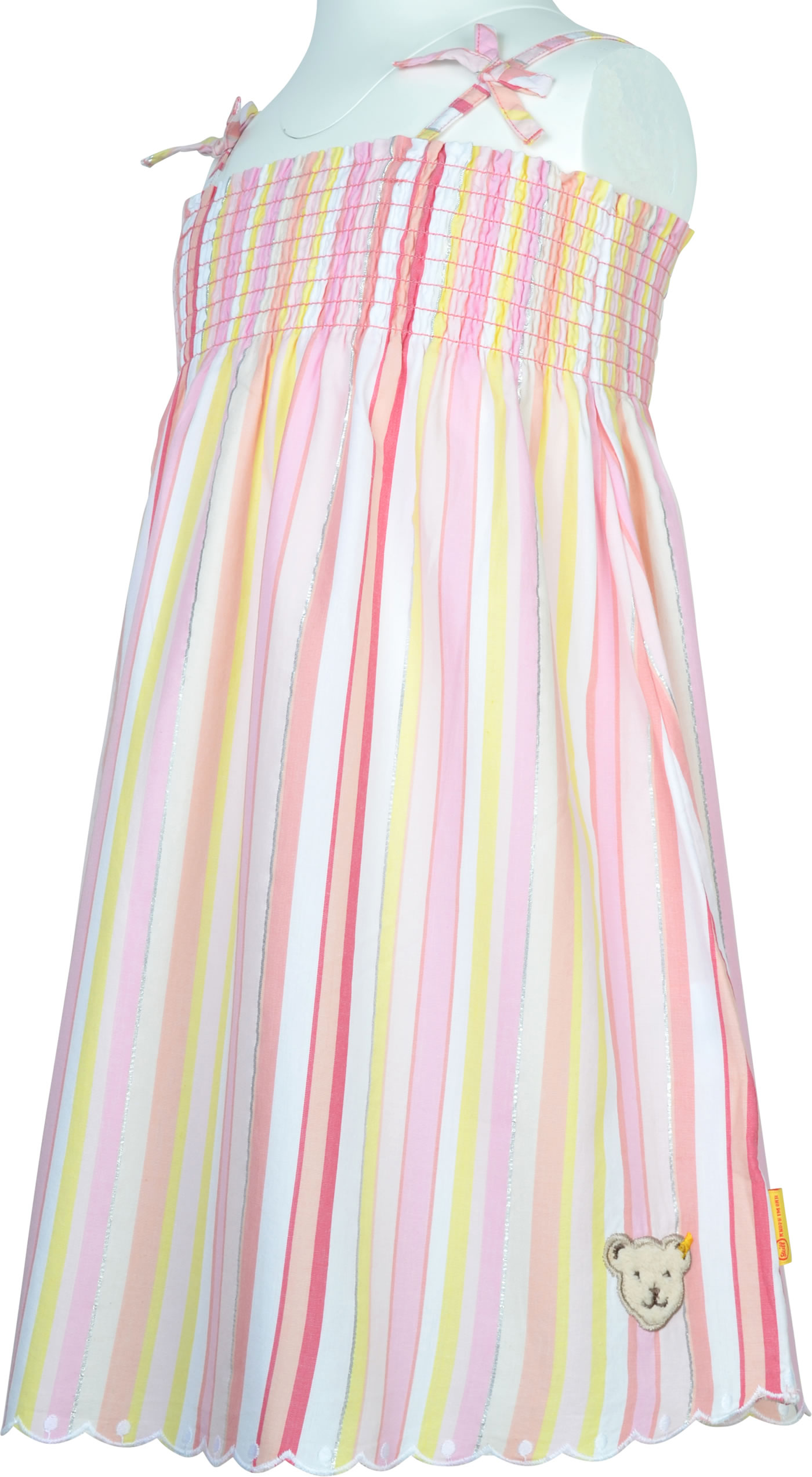 Hübsches Sommer-Kleid von STEIFF aus der Garden Party Kollektion. Das Kleid ist aus leichtem Baumwollstoff und hat einen lockeren Schnitt. Die Träger und der obere Teil sind elastisch und sorgen damit für einen perfekten Sitz. Schöne Details sind der abgerundete Saum, die silber schimmernden Streifen und der kleine STEIFF Bär auf der Vrorderseite.