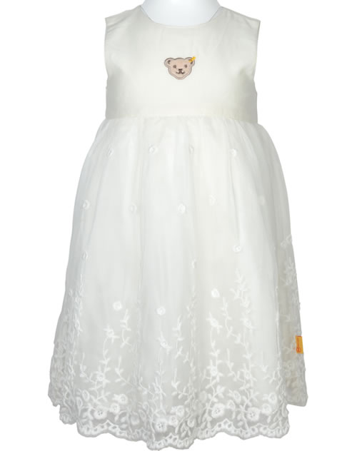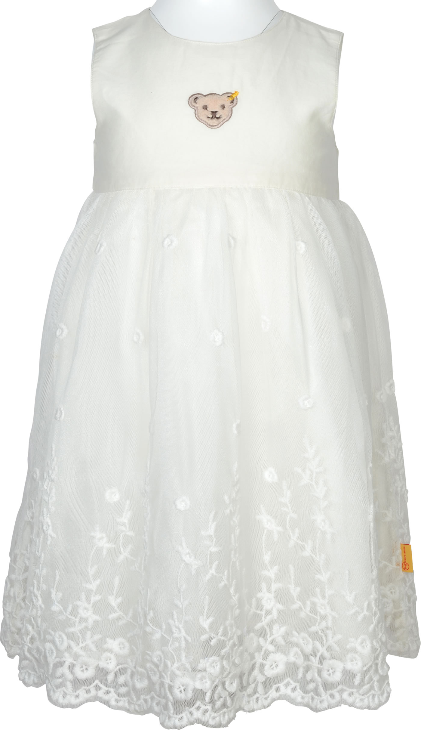 Festliches Träger-Kleid mit Tüllrock von STEIFF aus der Special Day-Kollektion. Das Kleid wird mit einem Reißverschluss auf dem Rücken verschlossen. Der Rock erhält sein Volumen durch drei Lagen aus weichem Baumwollfutter, Gaze und dem Außenstoff aus Tüll. Besonders schön sind die Blumen-Stickereien auf dem Rock und der STEIFF Bär auf der Vorderseite.