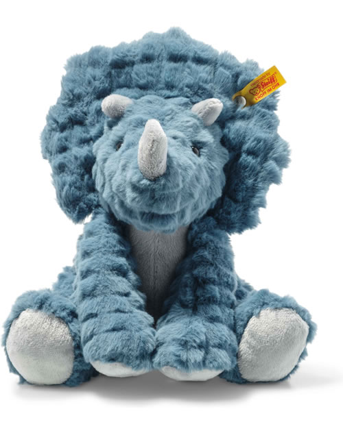 Dixi Triceratops ist 28 cm groß und aus kuschelweichem Plüsch gefertigt. Eine exotische Erscheinung in der Farbe Petrol. Das für ihn verwendete Plüschmaterial hat eine besondere Struktur die den Eindruck seiner besonderen Herkunft verstärkt. Seine Hörner, die Nase und der Bauch sind in Grau gehalten. Ebenso die Pfoten und die Fußsohlen. Mit eingearbeiteten Granulatsäckchen und gesticktem schwarzen Mund.