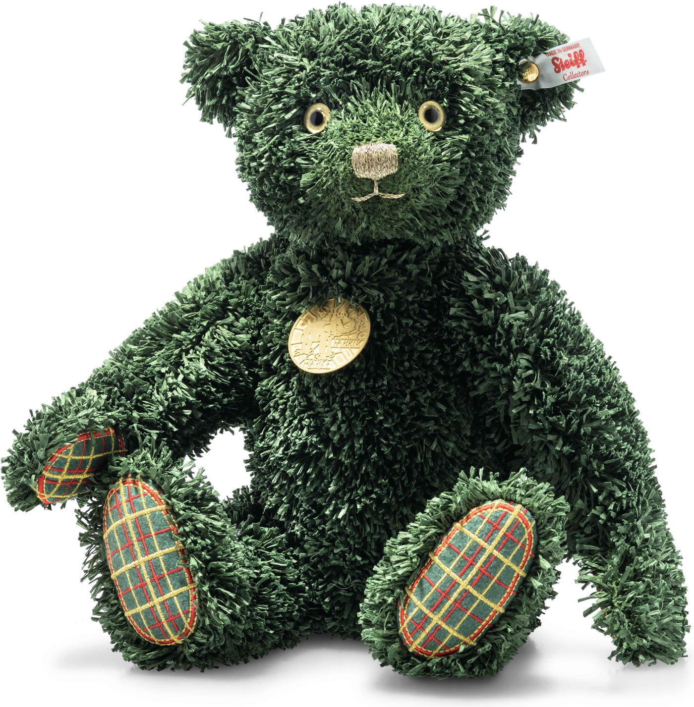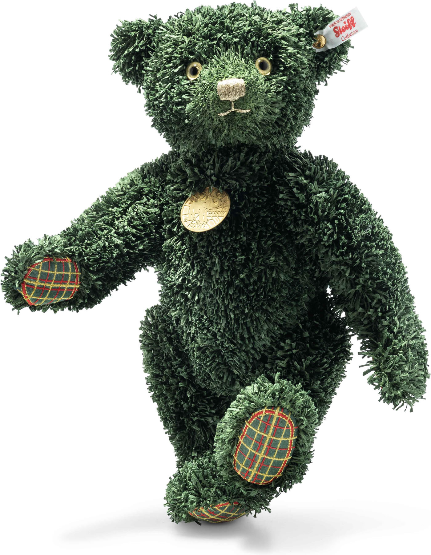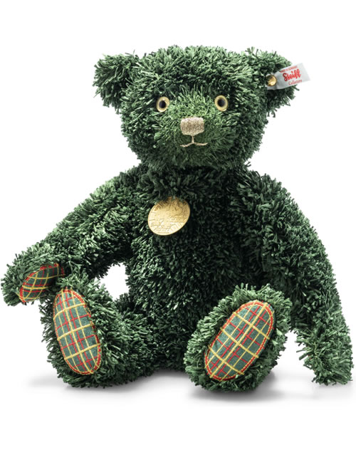 Er ist der erste weihnachtliche Vertreter unserer nachhaltigen Teddies for tomorrow: der 34 cm große, tiefgrüne Green Christmas Teddybär! Sein langfloriger Papierplüsch erinnert an weiche Tannennadeln – festlich geschmückt durch Pfoten in rot-gelbem Schottenkaro aus recyceltem Polyesterfilz, gefüllt mit recycelten PET Polyesterfasern und er hat einen vergoldeten „Knopf im Ohr“. Liebevoll mit Goldlack hintermalte Glas-Pupillenaugen, die champagnerfarben gestickte Nase und eine Messing-Halsmarke ziehen die Blicke magisch an. Ein stilvoller Begleiter fürs Weihnachtsfest: „Merry Christmas“ in aller Welt!