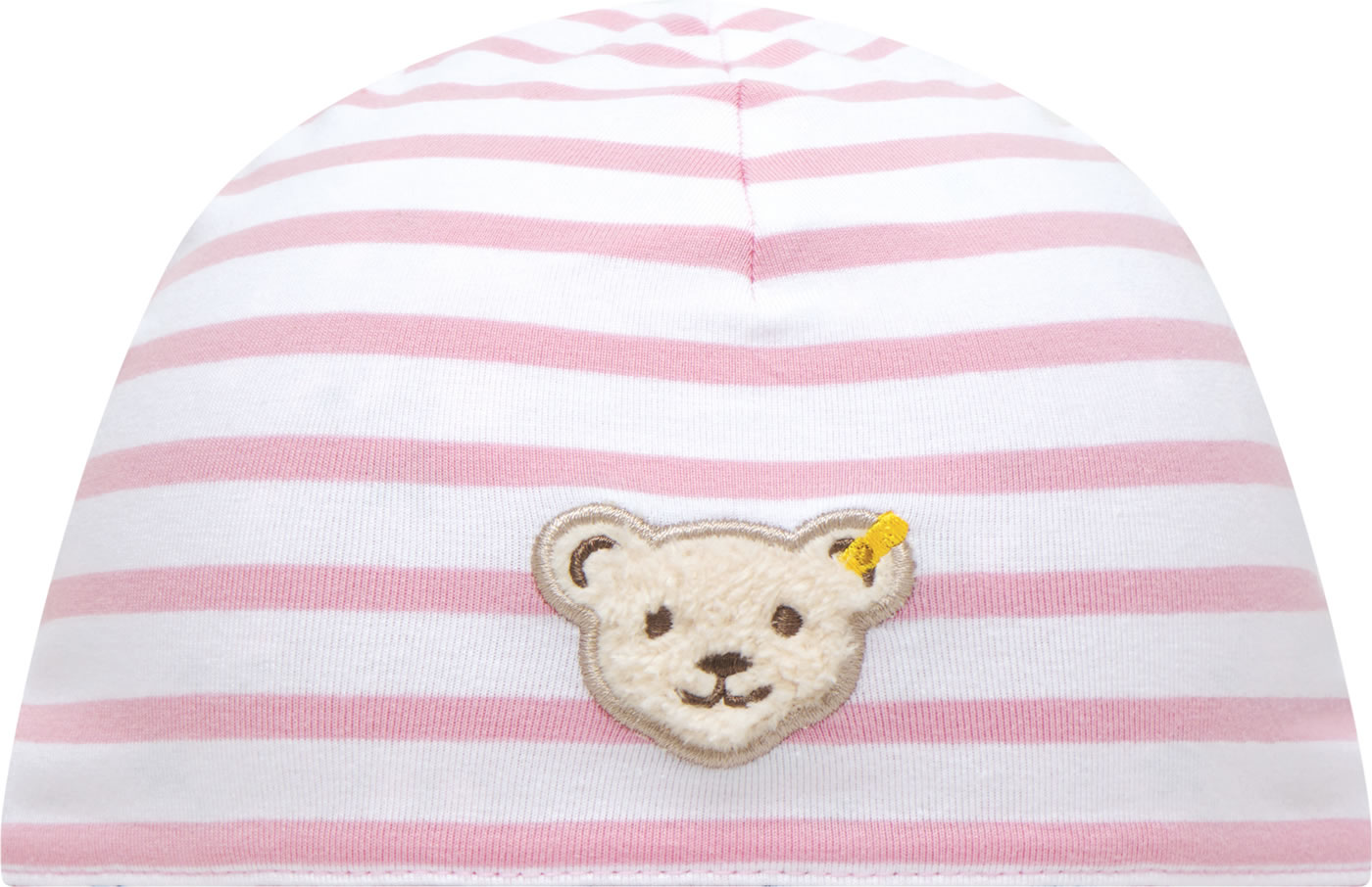 Jerseymütze zum Wenden für Mädchen von STEIFF aus der Beach Please Kollektion. Der kleine STEIFF Bär ziert die Vorderseite der doppellagigen Mütze. Die Mütze kann sowohl mit der gestreiften Seite als auch mit der bedruckten Seite nach außen getragen werden.
