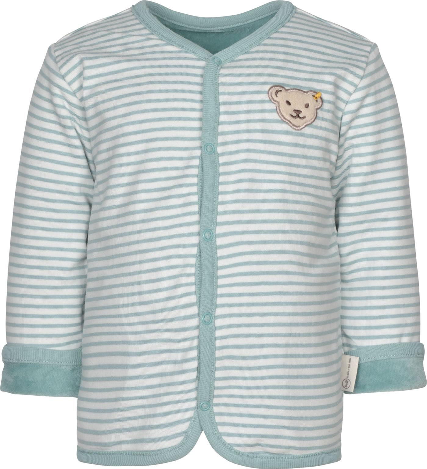 Hübsche Wende-Sweatjacke aus der Organic Dots-Kollektion von STEIFF. Die Jacke ist einseitig aus weichem Nicki-Material und hat zwei Eingrifftaschen. Der STEIFF Bär ziert die Vorderseite. Die Wendeseite ist aus geringeltem Jersey. Die Jacke läßt sich per Druckknöpfe schließen.