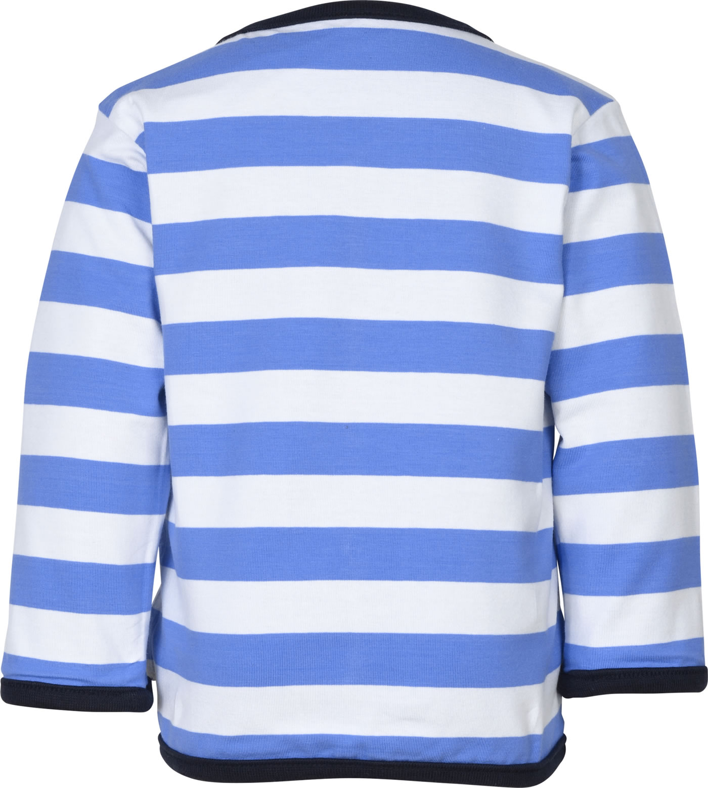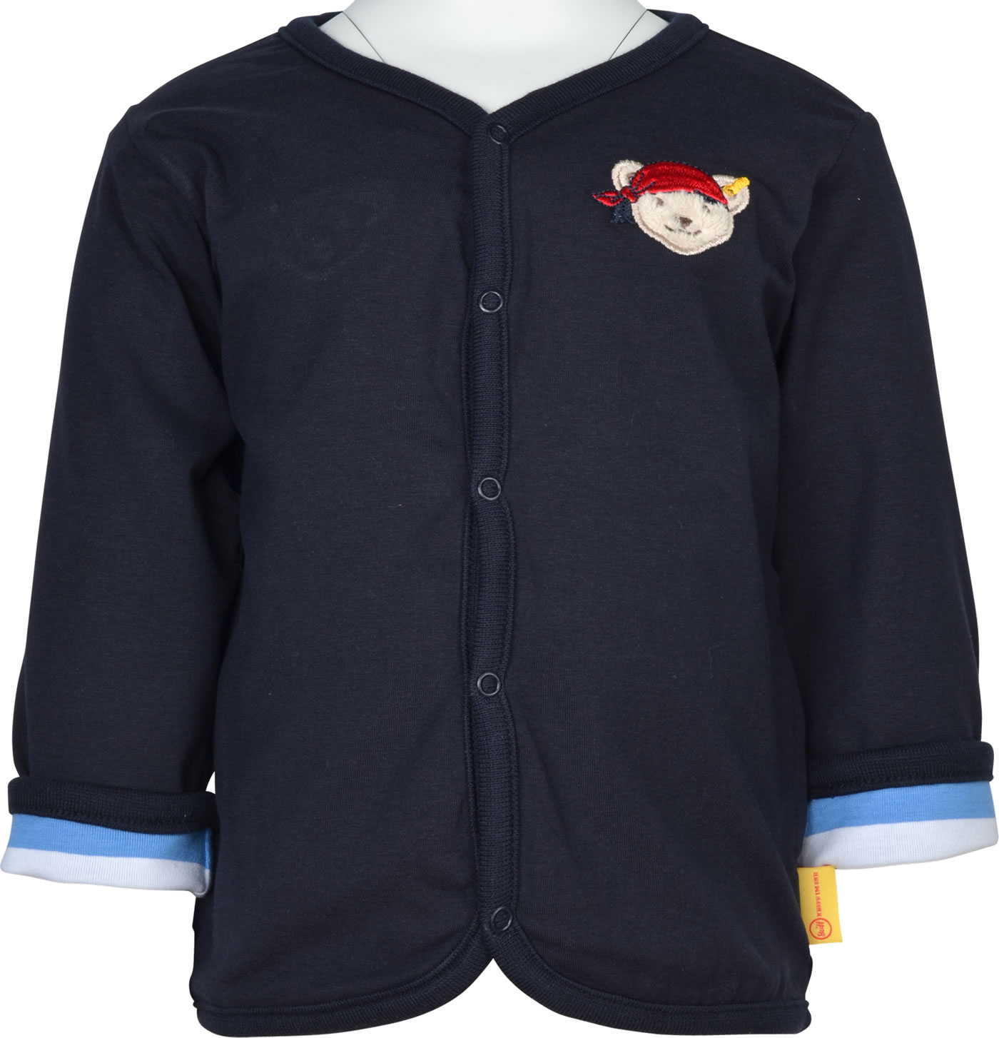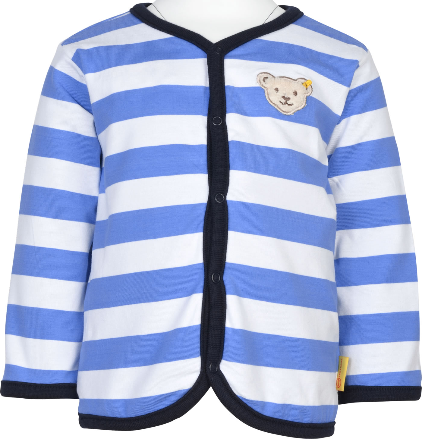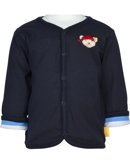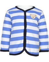 Sweatjacke zum Wenden für Jungen aus der Under the Surface-Kollektion von STEIFF Die Jacke wird mit Druckknöpfen verschlossen. Je nach Lust und Laune kann die SweatJacke mit der dunkelblauen oder der gestreiften Seite getragen werden. Der STEIFF Bär ziert jeweils die Brust.