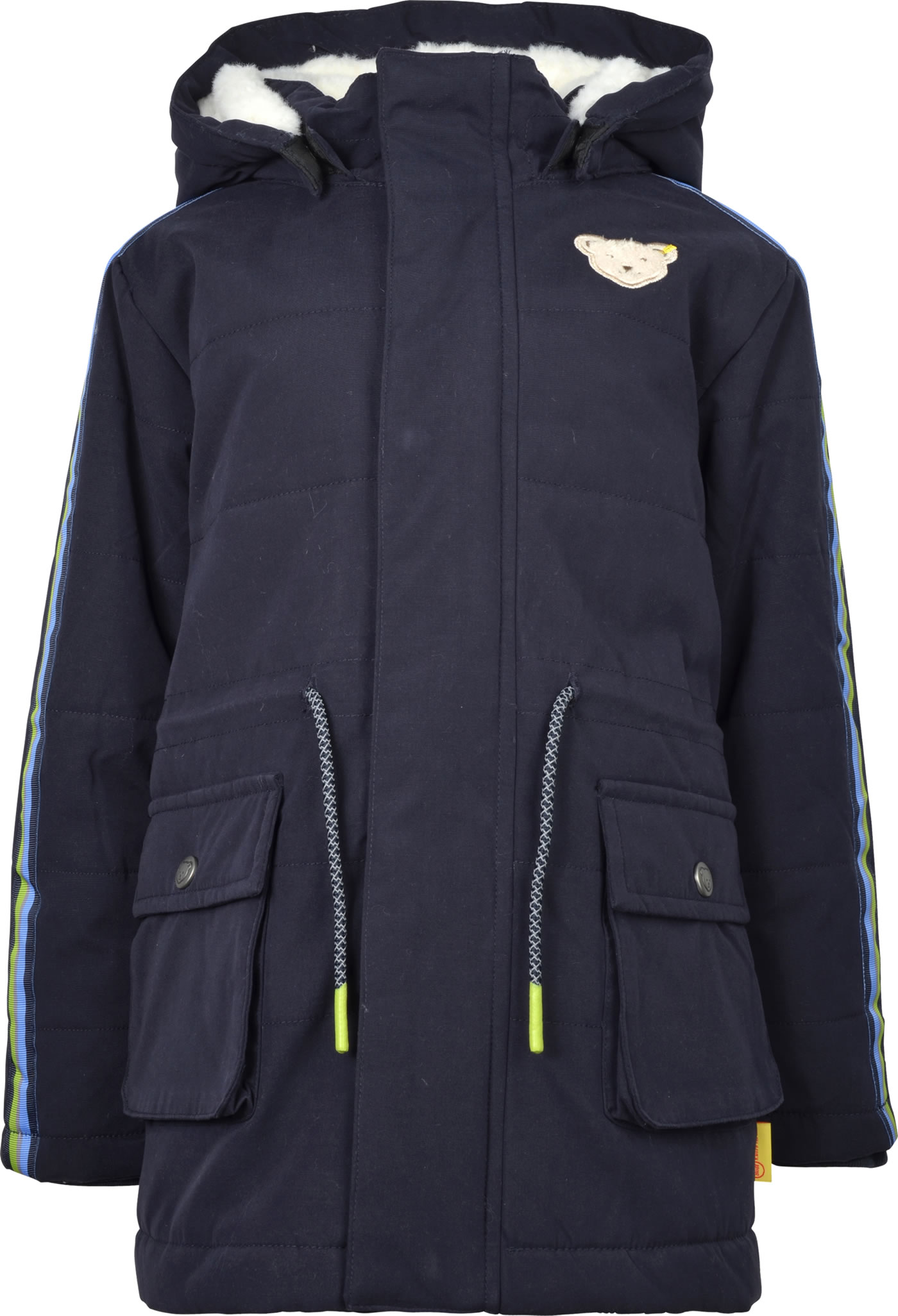 Warme wattierte Winter-Jacke von STEIFF aus der Pawerful-Kollektion für Jungen. Die atmungsaktive BIONIC-FINISH ECO-Imprägnierung ist fluorfrei und macht sie wasser- und schmutzabweisend. Die abnehmbare Kapuze ist mit Teddy-Plüsch gefüttert. Gefüttert ist die Jacke mit weichem Fleece. Der kleine STEIFF Bär befindet sich auf der Brust und als reflektierendes Element auf der Rückseite. Zwei Eingrifftaschen bieten Platz für kleine Schätze. Verschlossen wird die Jacke mit einem Reißverschluss. Ärmelbündchen bieten Schutz vor dem Wind.