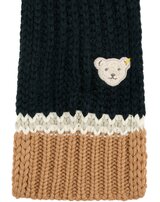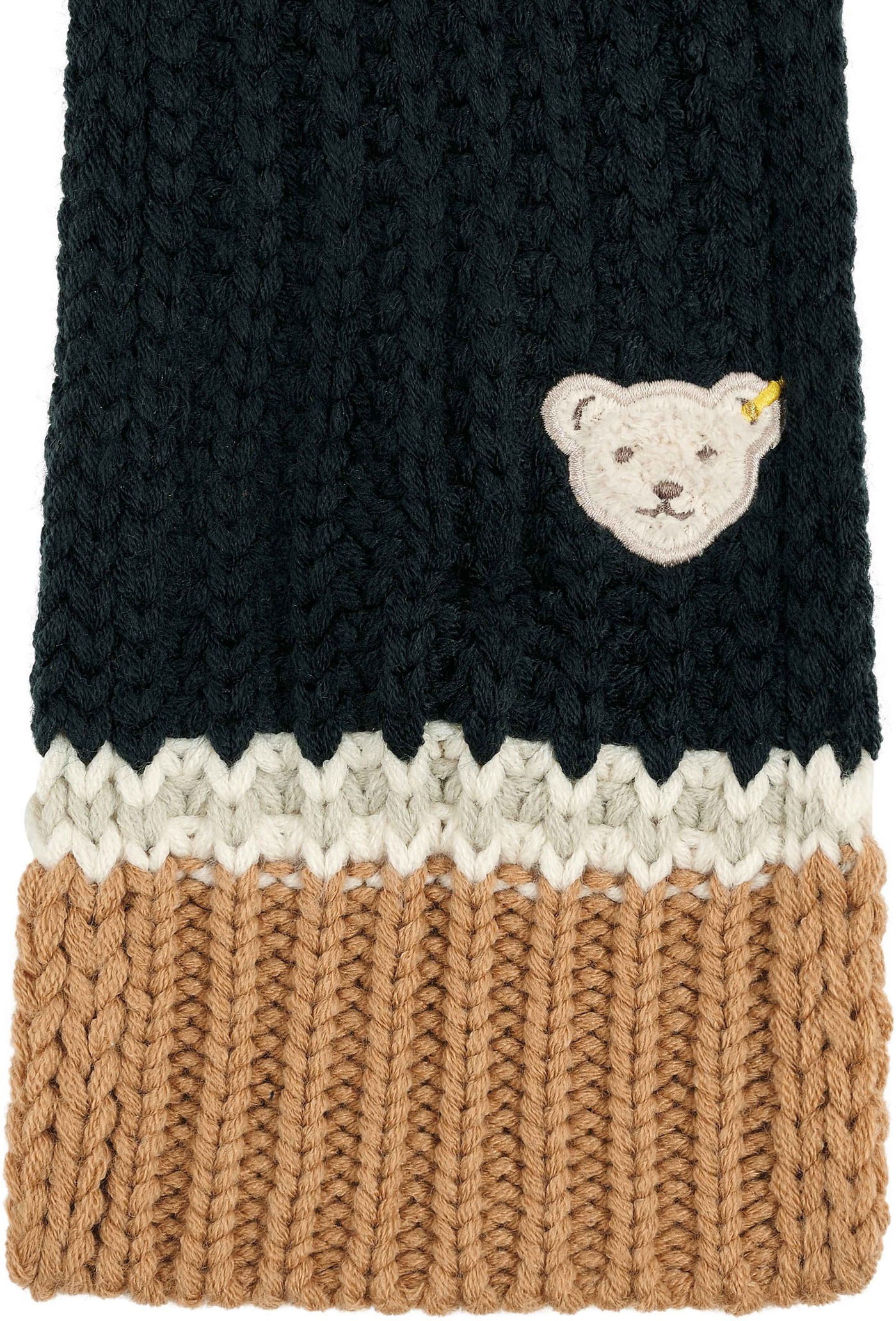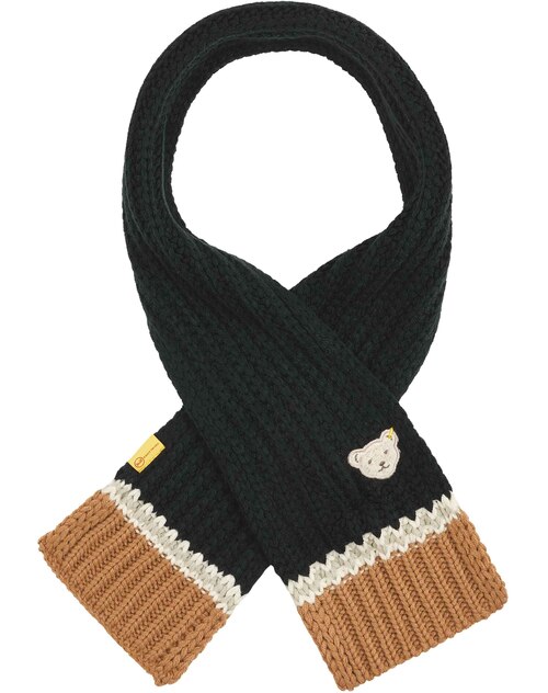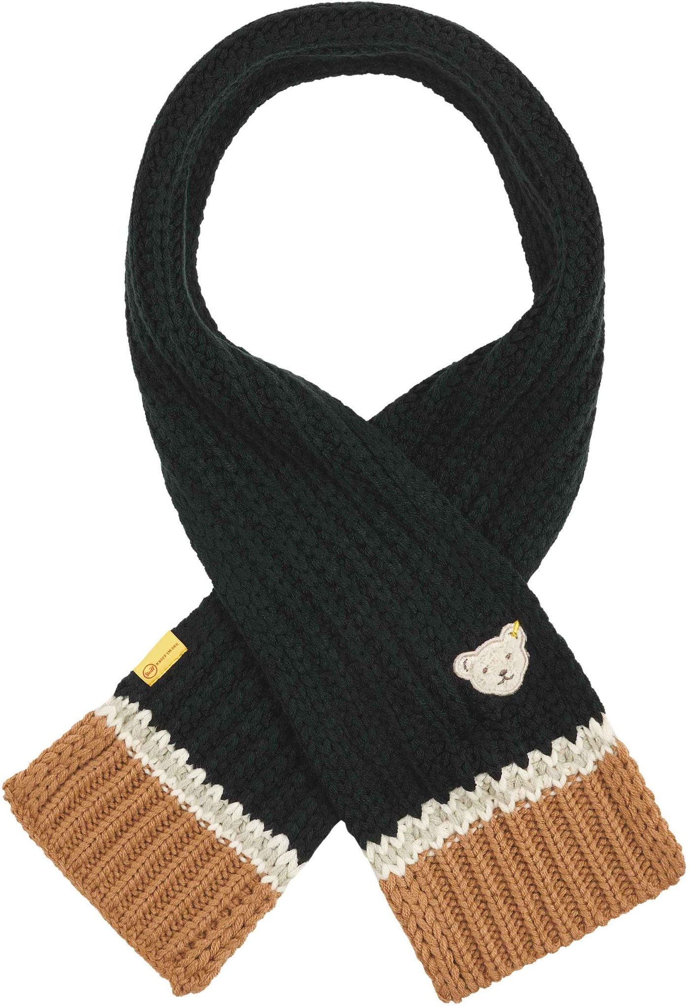 Wenn es draußen kühler und ungemütlicher wird, geht es mit dem kuscheligen Schal zu Ausflügen und Abenteuern. Als Wärmespender aus hochwertiger Acrystrickqualität, ist für Tragekomfort mit Kuschelfaktor gesorgt. Feingerippte Bündchen halten das Accessoire perfekt in Form. Das besondere Strickmuster in dunklen Farbtönen an den Schalenden begeistert trendbewusste Jungen und ist nach Lust und Laune kombinierbar. Für alle Fälle begleitet ein kleines Steiff Teddybärmotiv Ihren Kleinen zu allen Unternehmungen. Mit Wohlfühlgarantie!