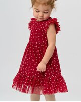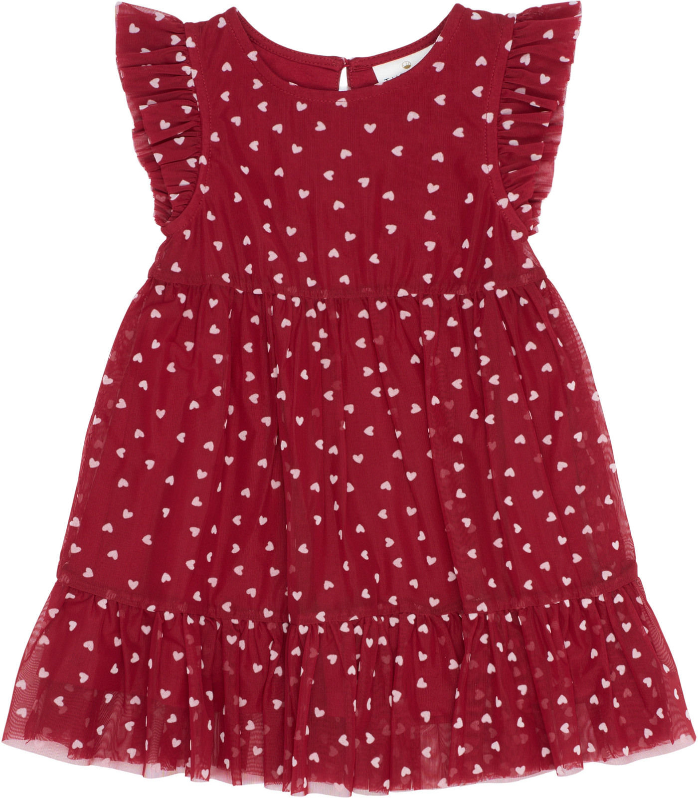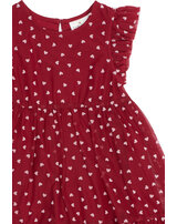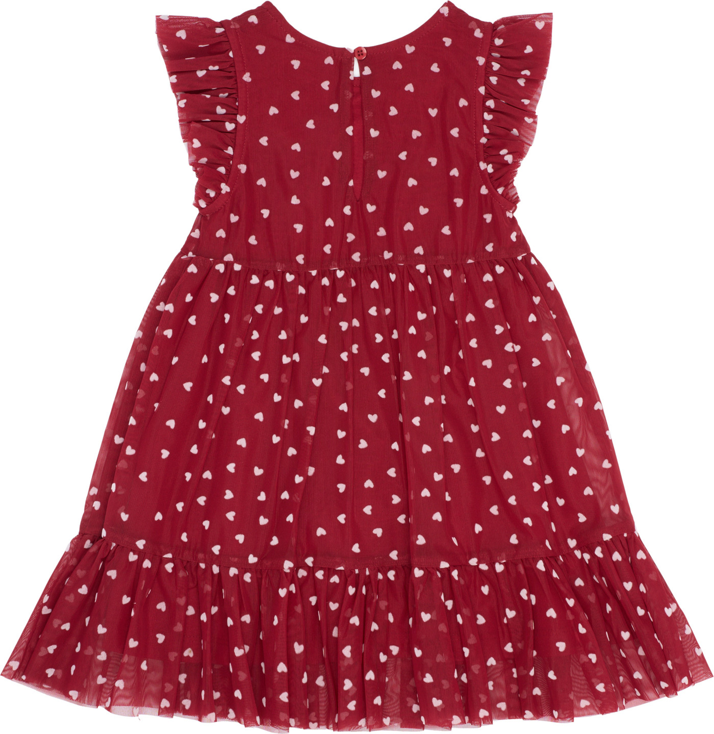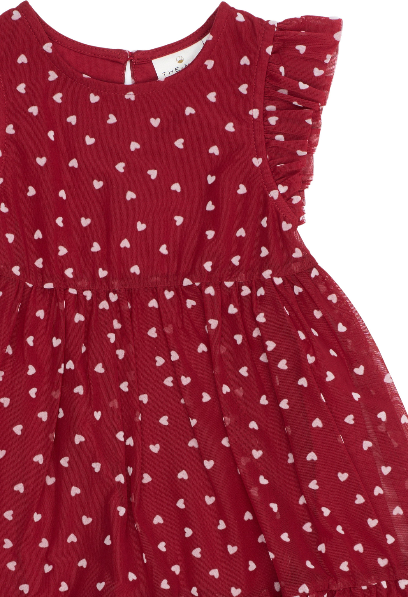Der mehrlagige Tüll mit zartem Herzchen-Allover verleiht dem Kleid eine luftige Leichtigkeit, während hübsche Rüschen an Ärmeln und Saum für charmante Details sorgen.