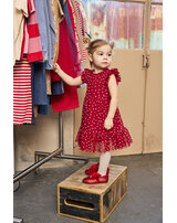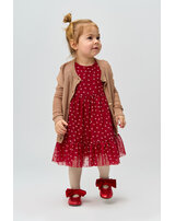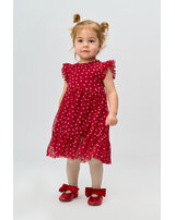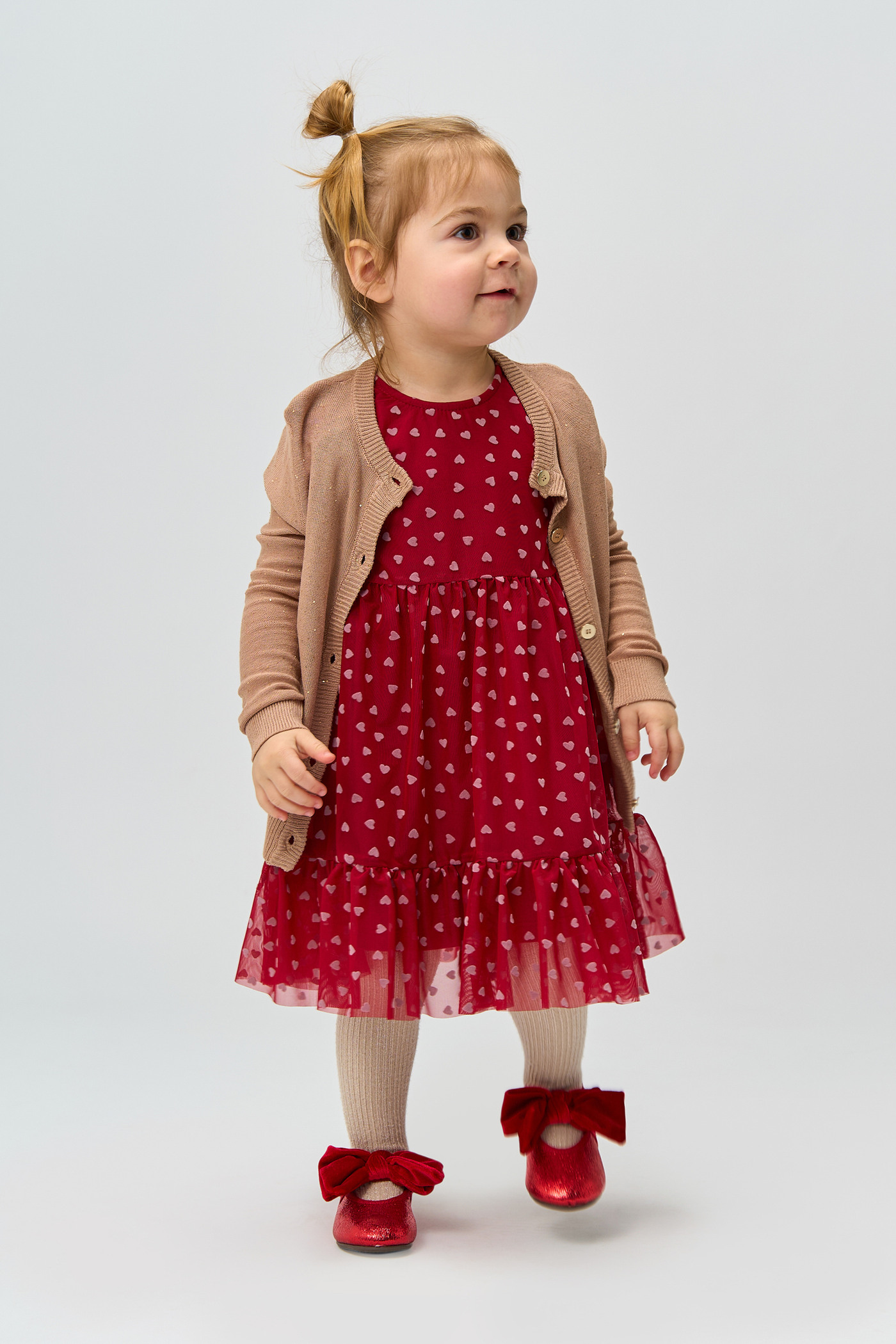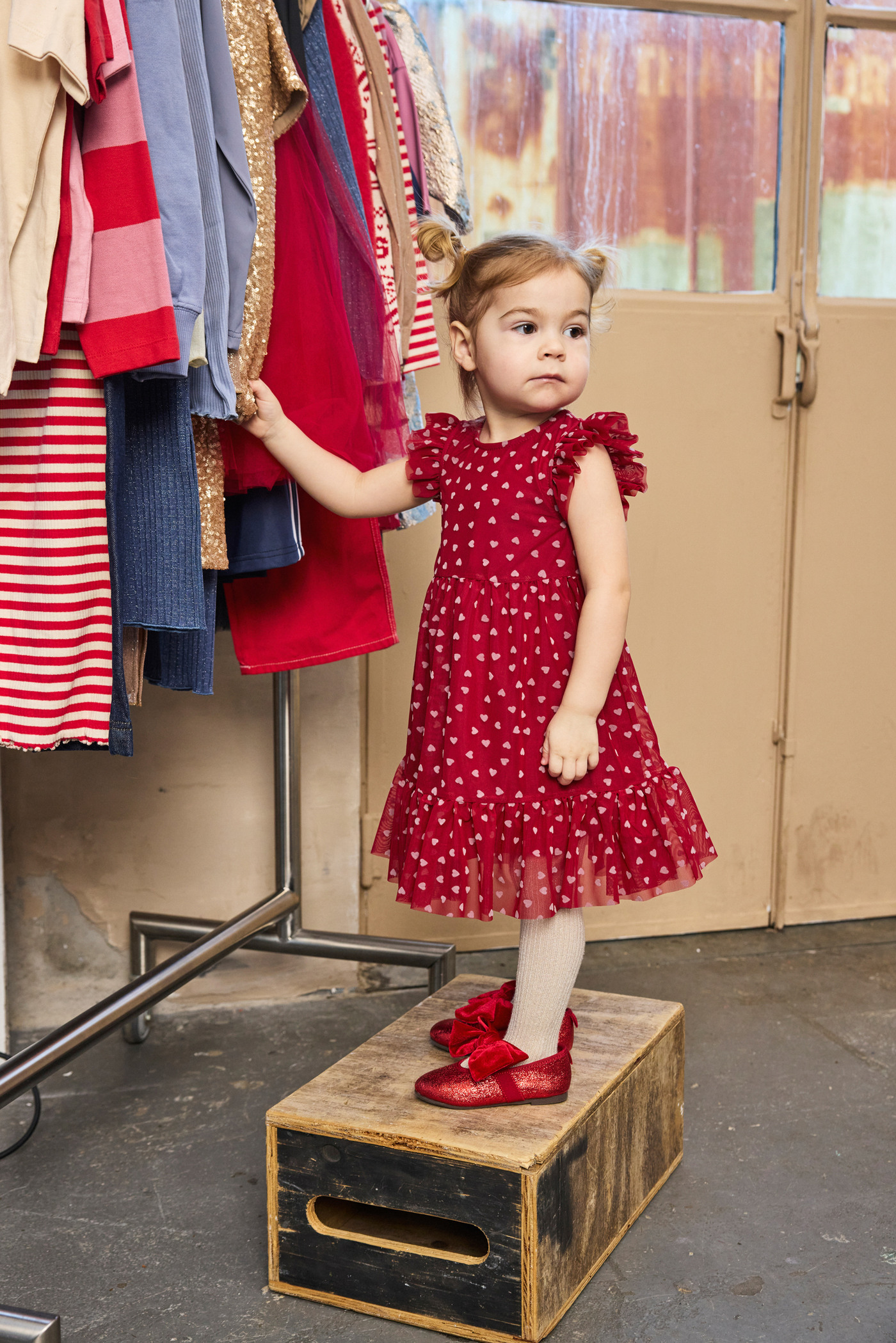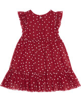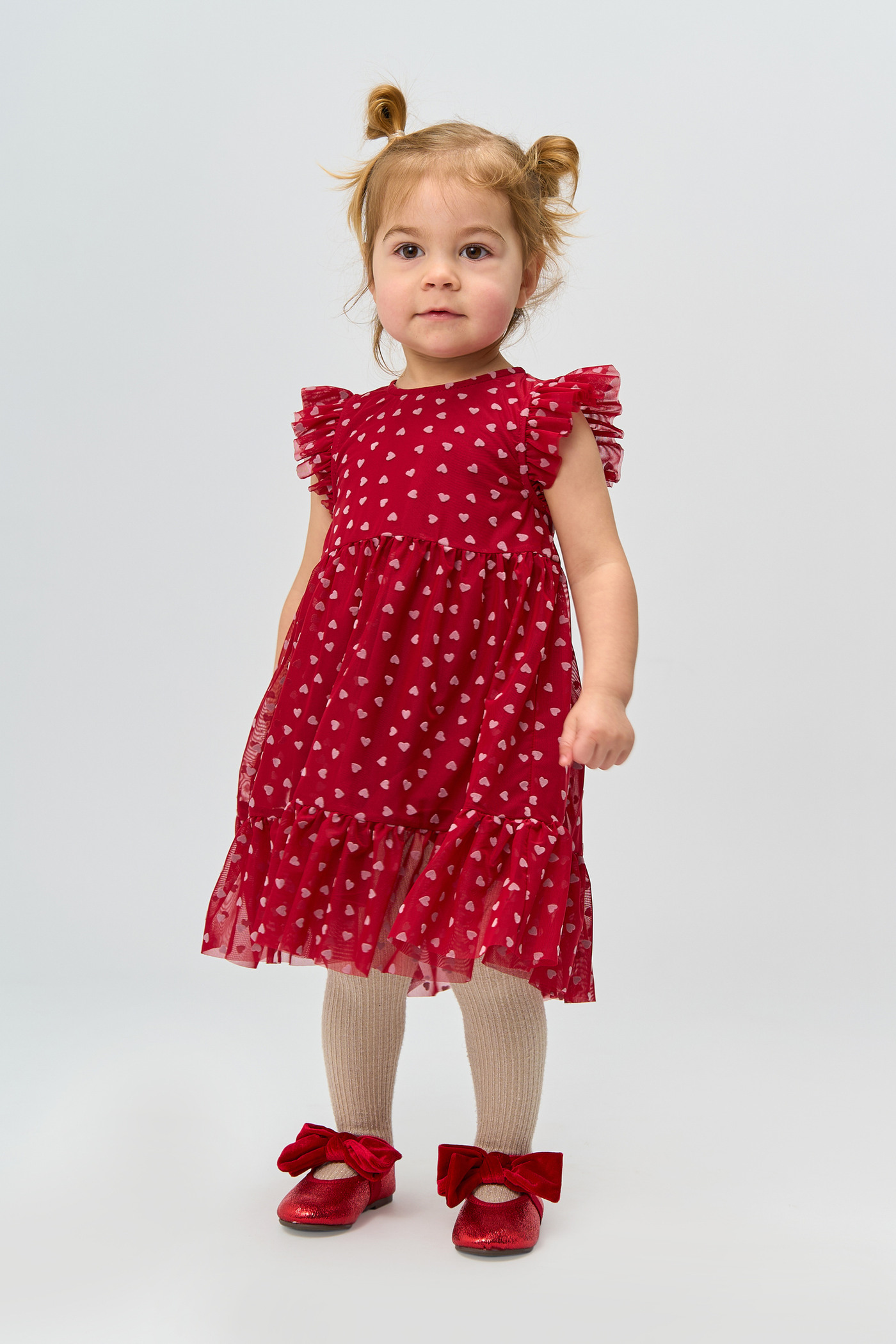 Der mehrlagige Tüll mit zartem Herzchen-Allover verleiht dem Kleid eine luftige Leichtigkeit, während hübsche Rüschen an Ärmeln und Saum für charmante Details sorgen.