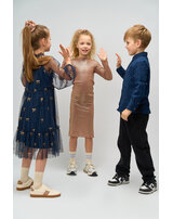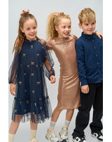 Die feinen Rüschen an Schultern und Rock zaubern einen wunderschönen Look, während das leichte Mesh-Gewebe mit goldglitzernden Schleifen verziert ist. 🎀✨