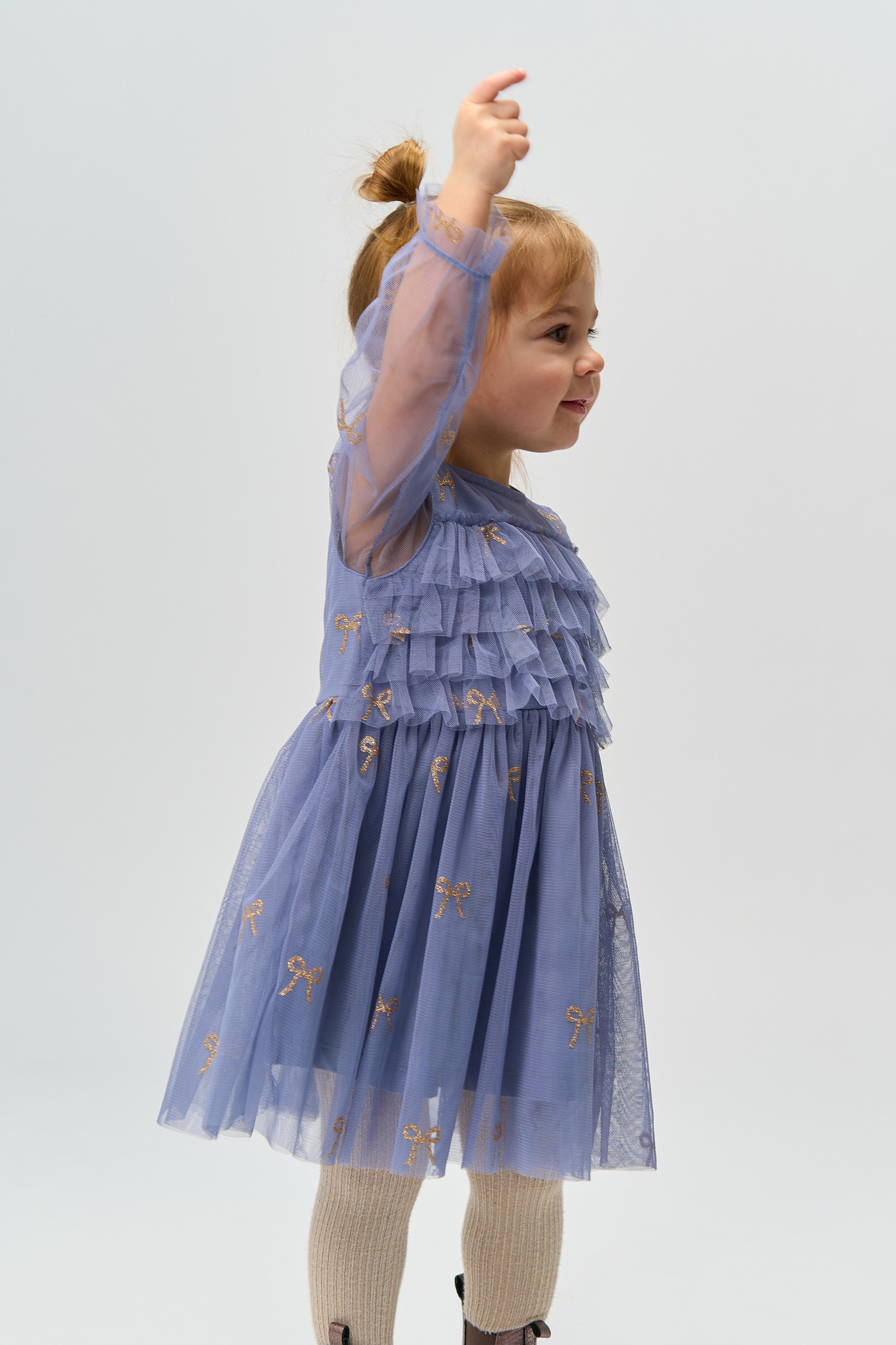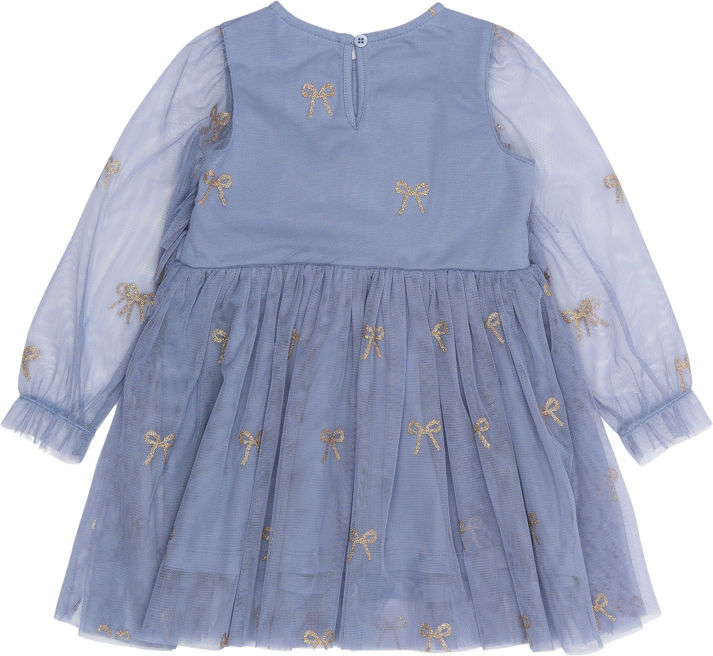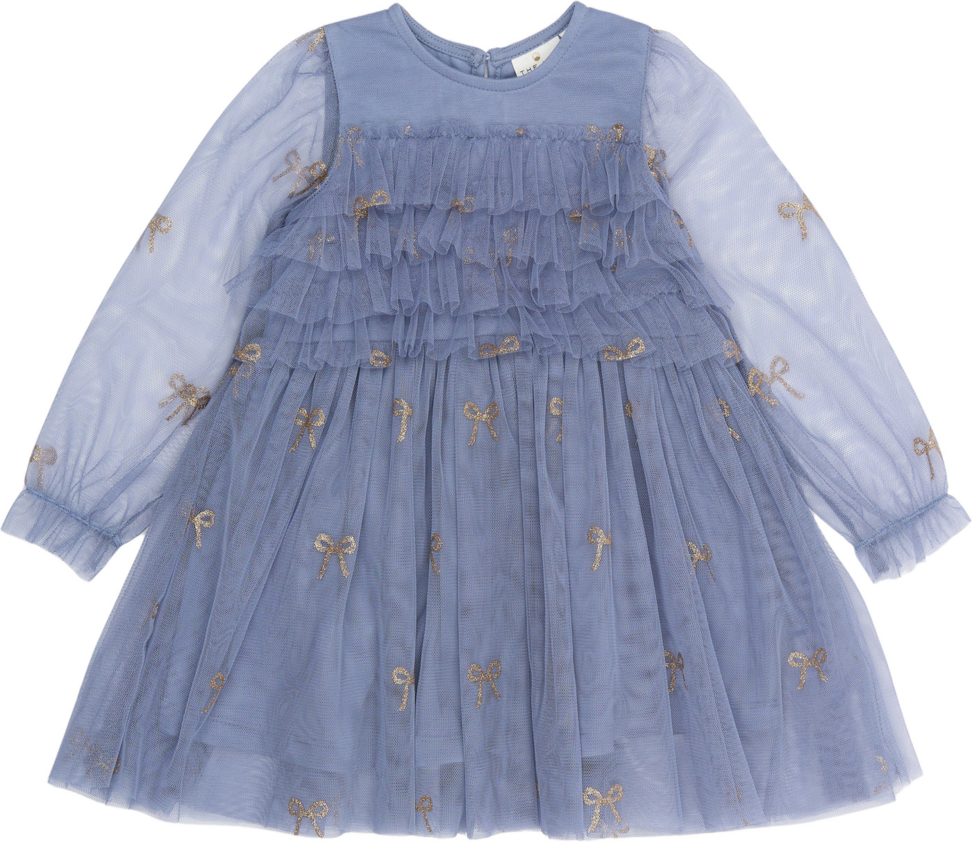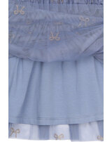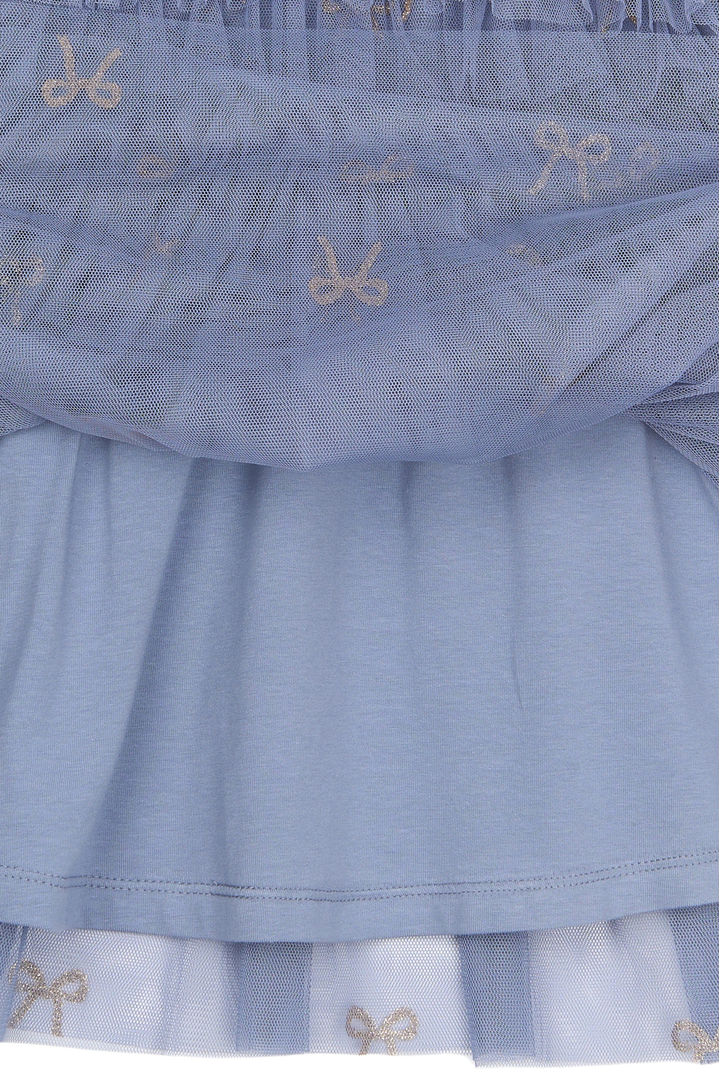 Der mehrlagige Tüll ist mit wunderschönen, goldglitzernden Schleifen bedruckt und verleiht dem Kleid einen zarten, femininen Look. 🎀✨