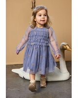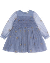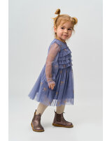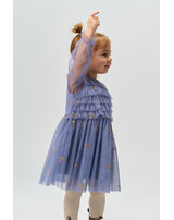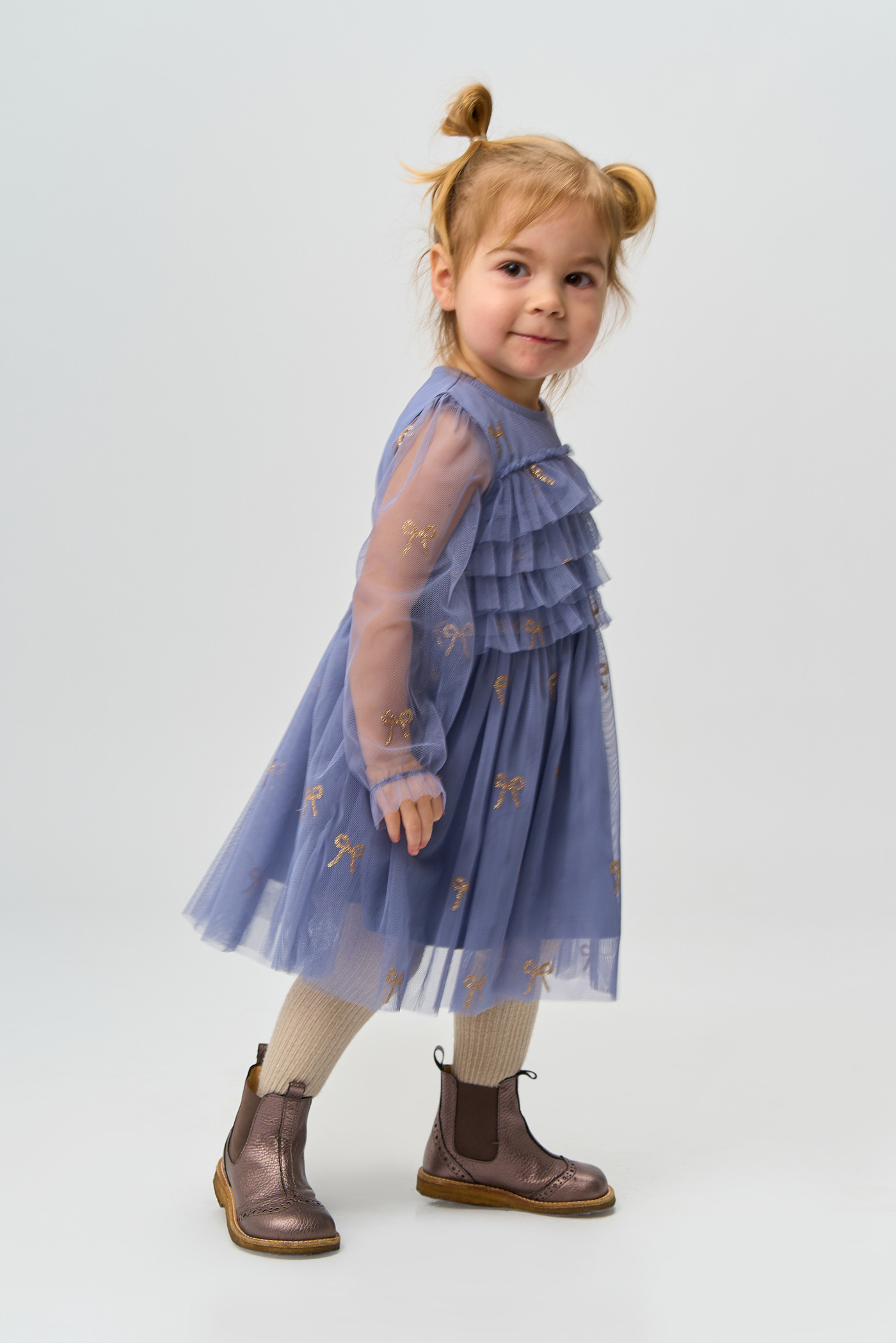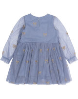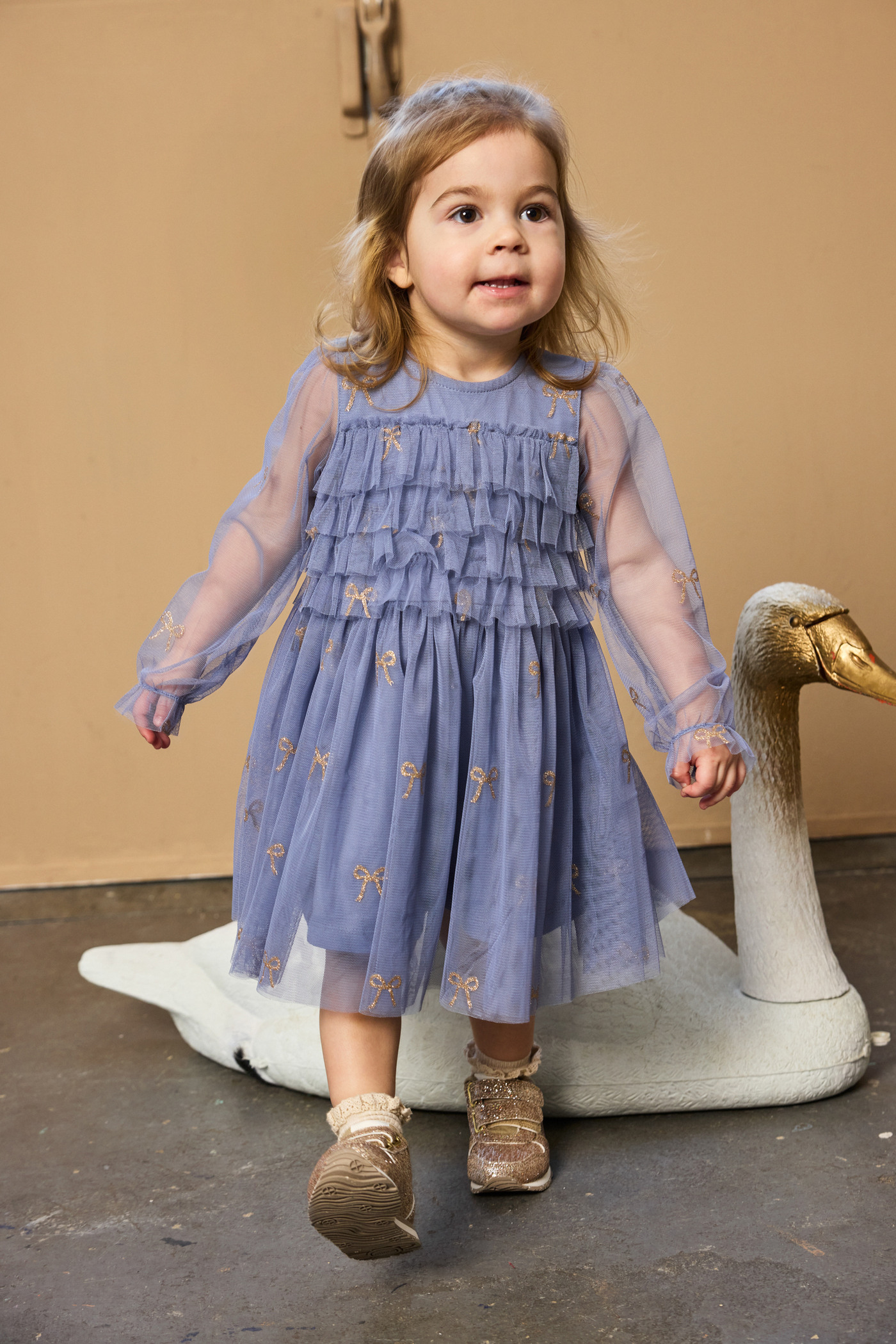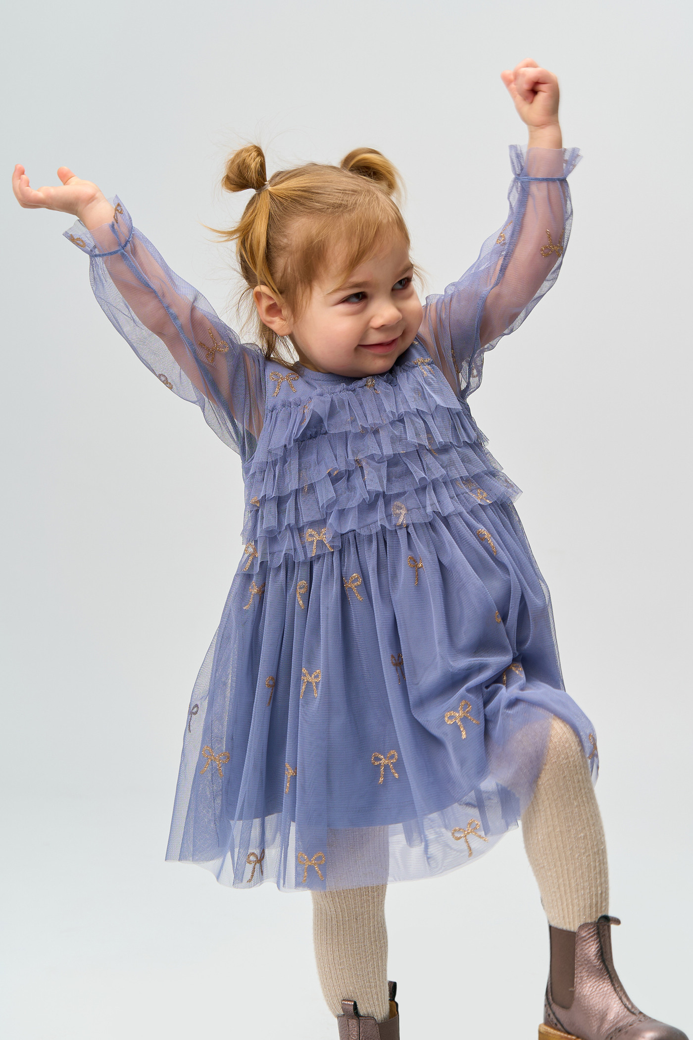 Der mehrlagige Tüll ist mit wunderschönen, goldglitzernden Schleifen bedruckt und verleiht dem Kleid einen zarten, femininen Look. 🎀✨