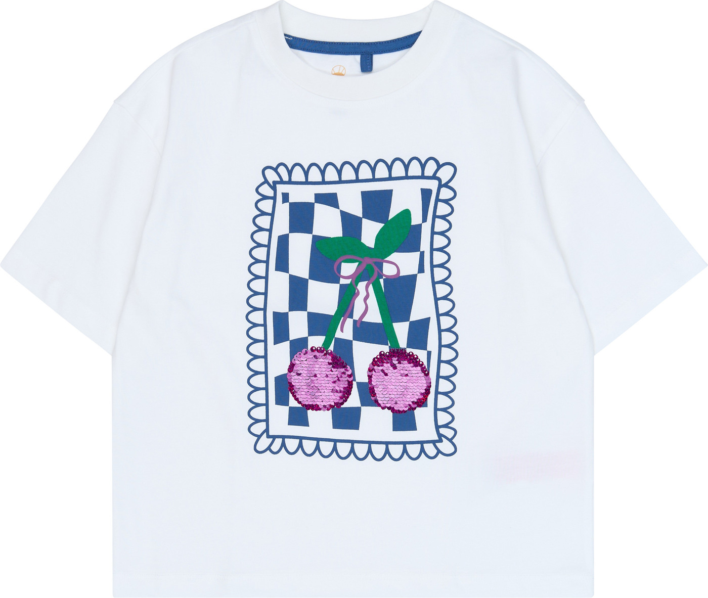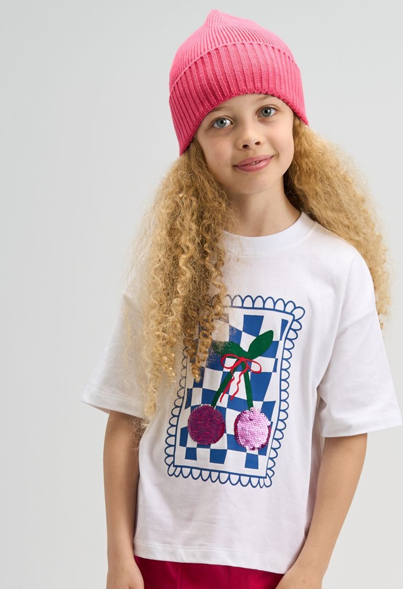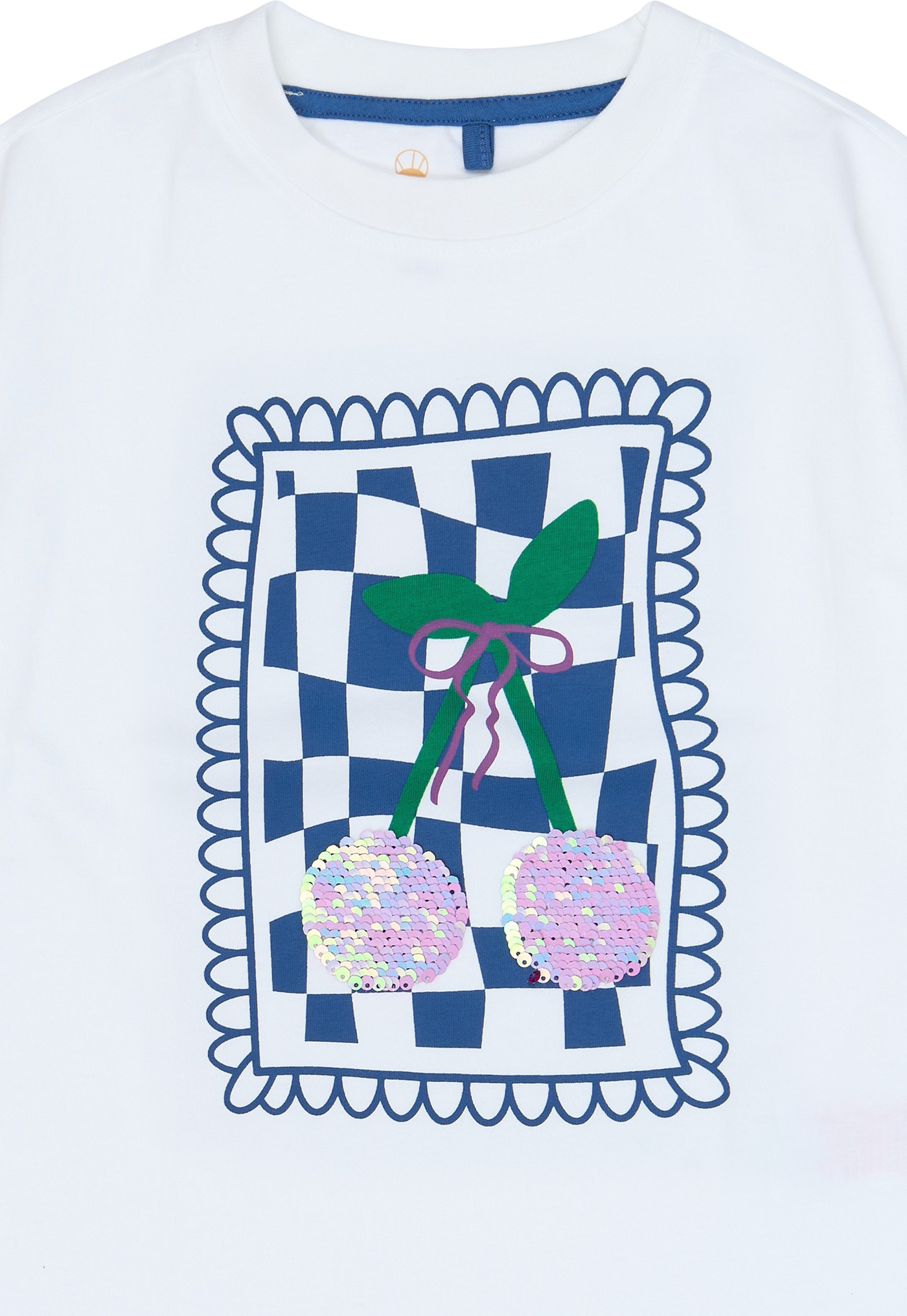 Auf der Vorderseite begeistert es mit dem coolen Aufdruck einer Kirsche, die mit Pailletten verziert ist. 🍒😍