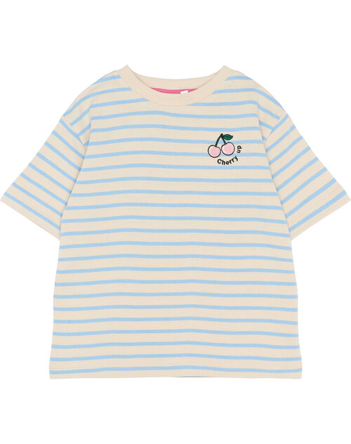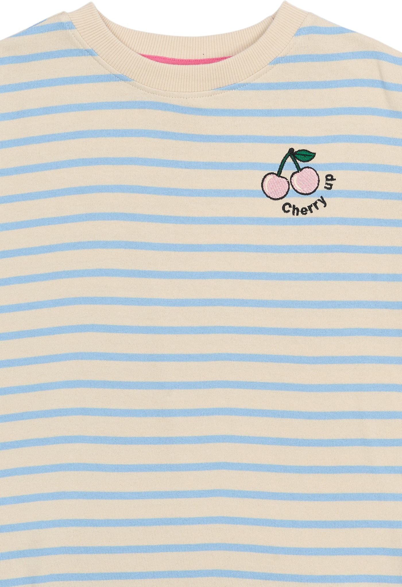 Es begeistert mit dem farbenfrohen hellblauen Streifendesign und der bestickten Kirsche auf Brusthöhe. 🍒