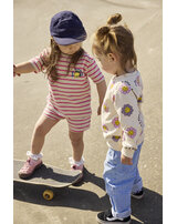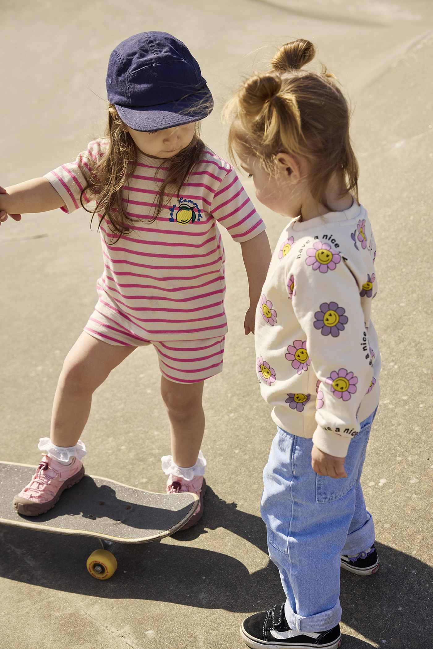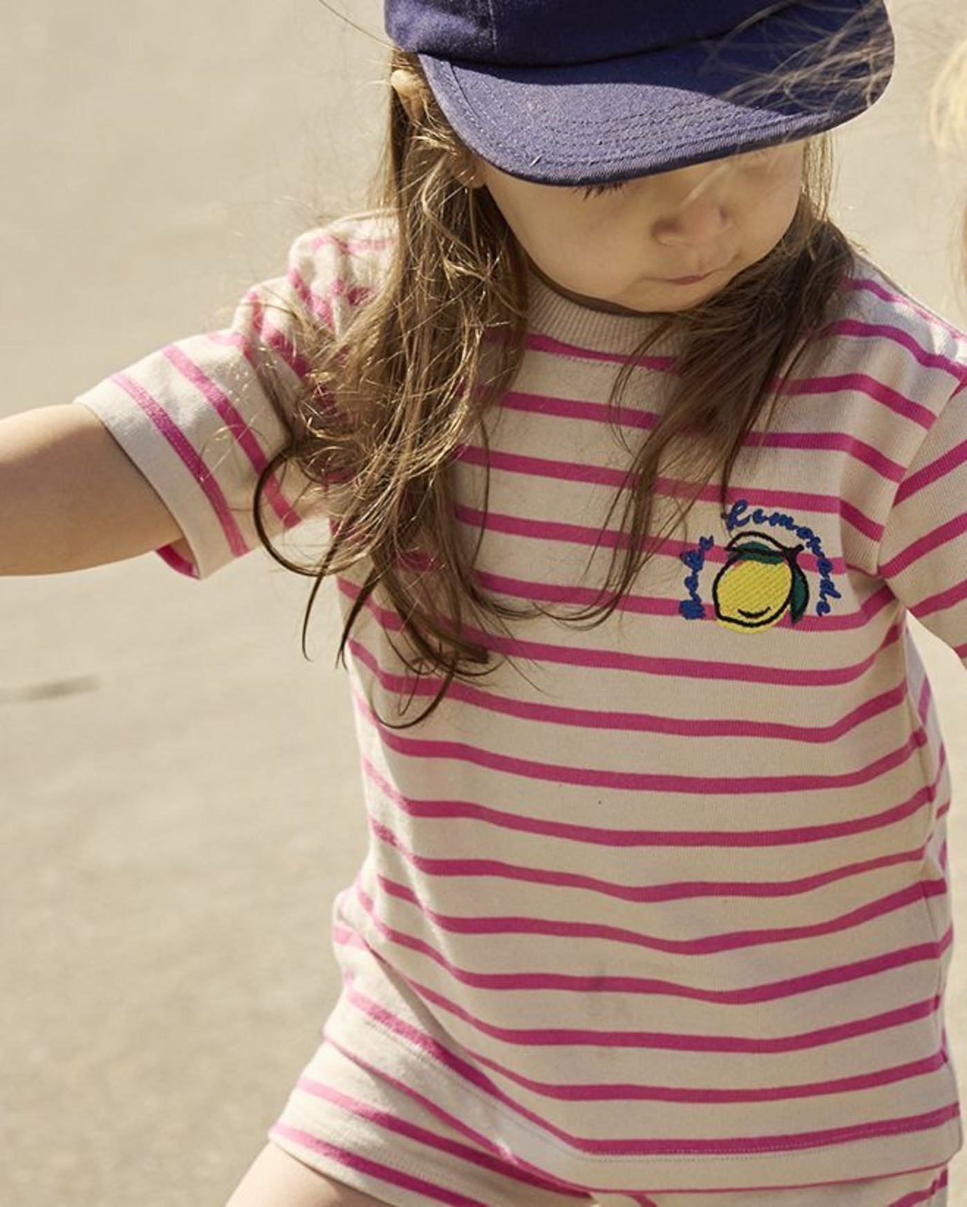 Es begeistert mit dem farbenfrohen pinken Streifendesign und der bestickten Zitrone auf Brusthöhe. 🍋
