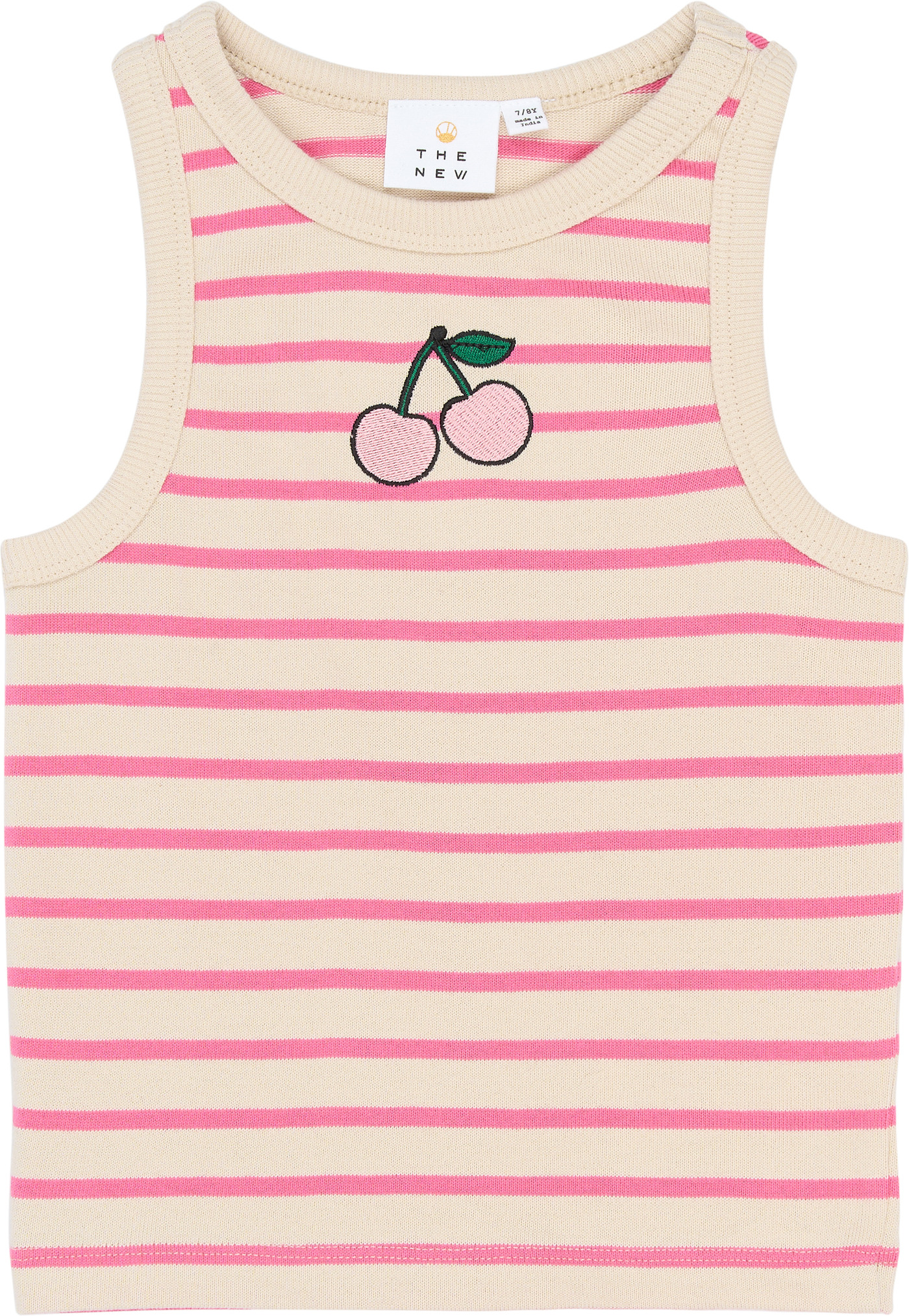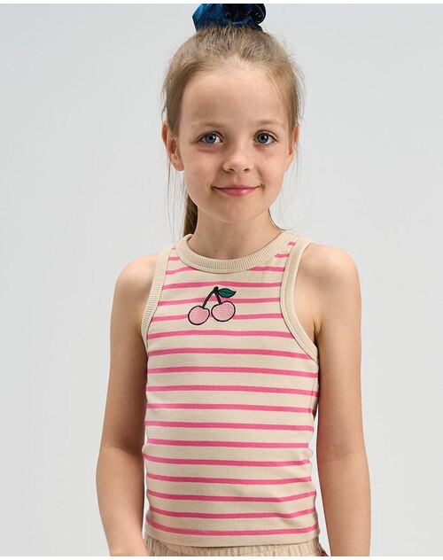 Es begeistert mit dem farbenfrohen pinken Streifendesign und der bestickten Kirsche mittig auf Brusthöhe. 🍒