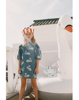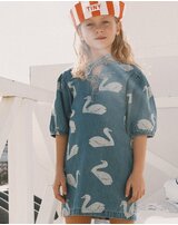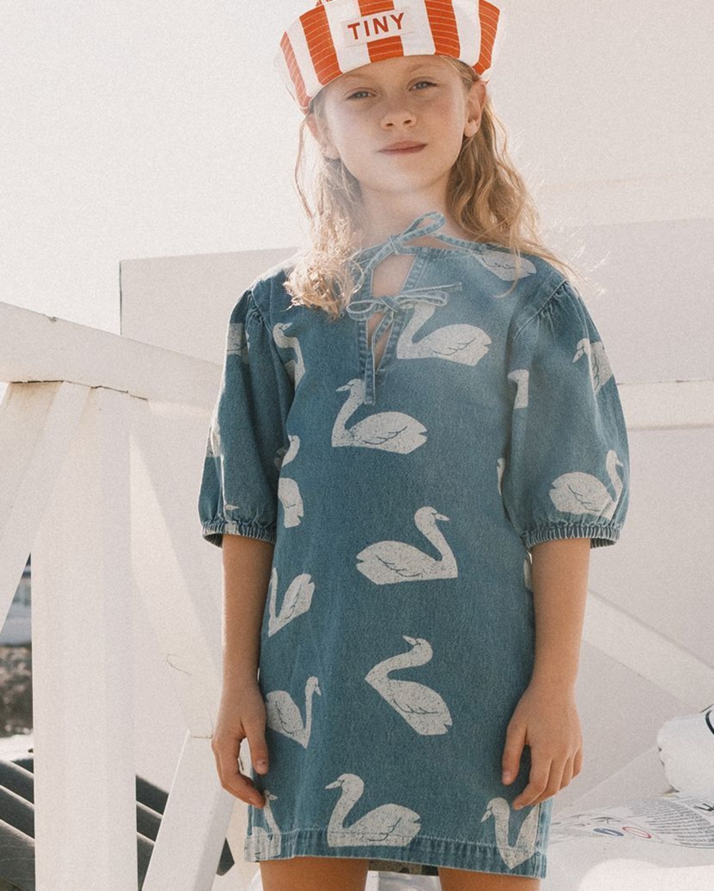 Dieses bezaubernde halbärmlige Jeans-Kleid vom spanischen Label Tiny Cottons ist aus reiner Baumwolle gefertigt und begeistert mit den vielen Schwänen rundum. 🦢
