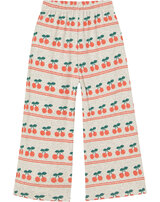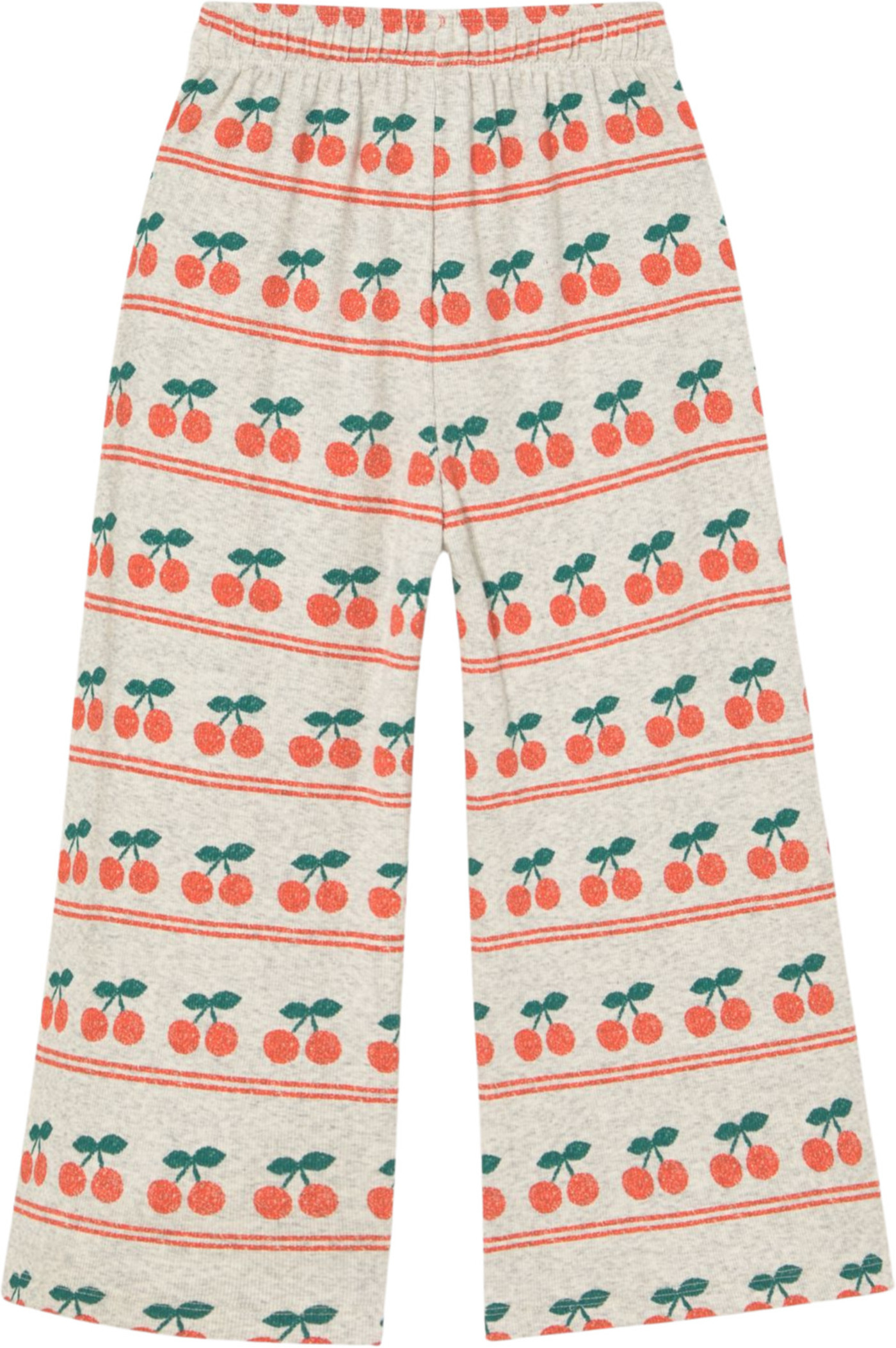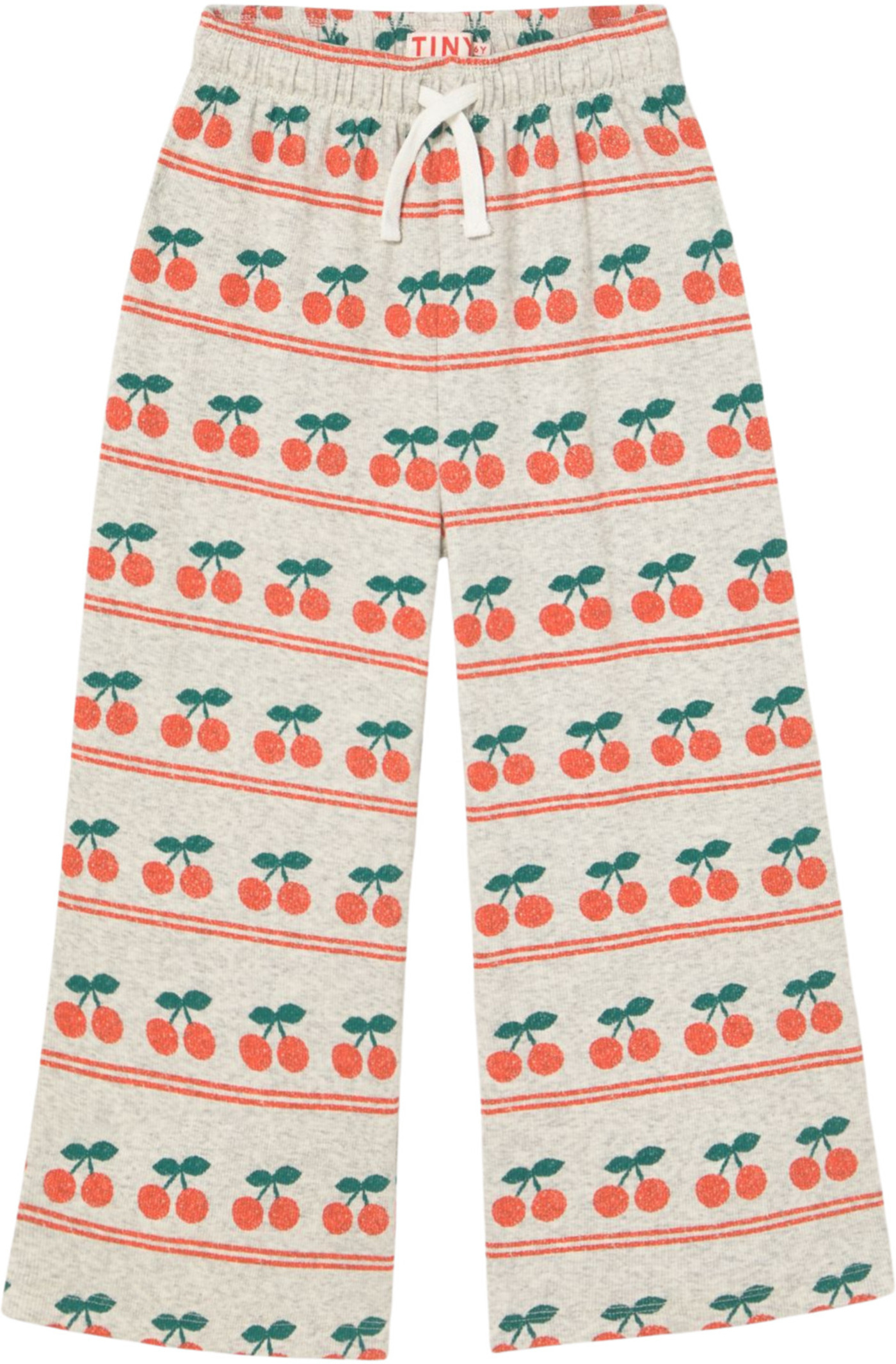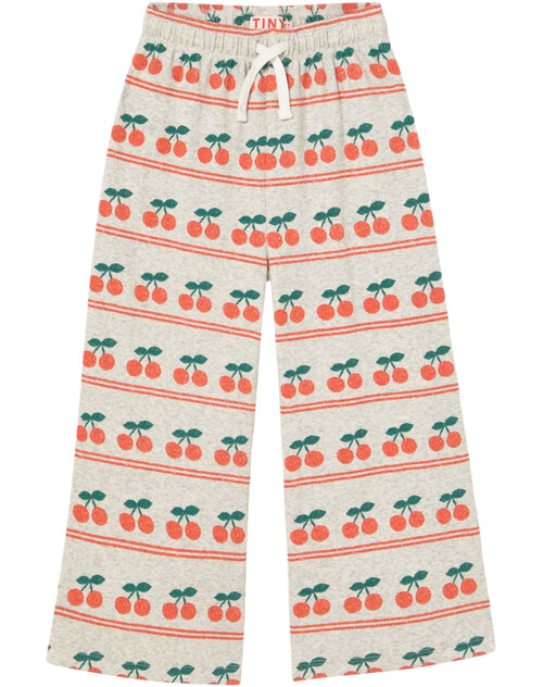 Diese coole und hochwertige Ripp-Hose von Tiny Cottons ist beige-grau meliert und bedruckt mit vielen Kirschen, die untereinandergreiht sind. 🍒
