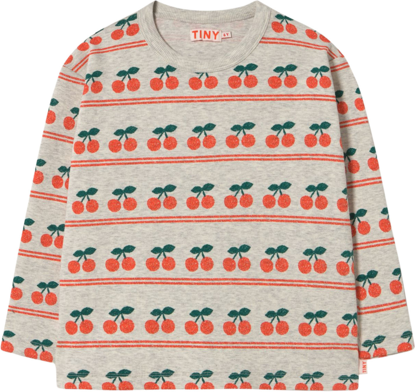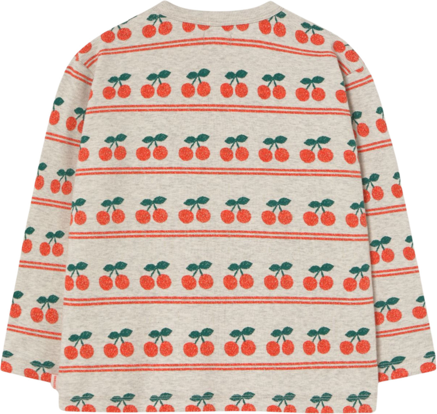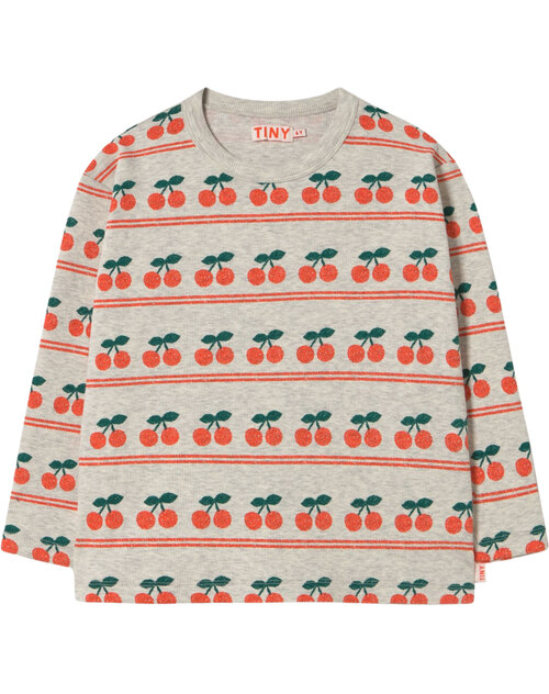 Dieses coole und hochwertige Ripp-Langarmshirt von Tiny Cottons ist beige-grau meliert und bedruckt mit vielen Kirschen, die untereinandergreiht sind. 🍒