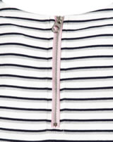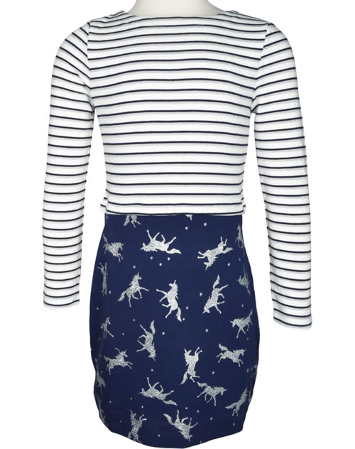Hübsches Kleid im 2in1-Look von TOM JOULE. Der Rock ist im glitzernden Einhorn-Design gearbeitet und das Oberteil mit Rundhalsausschnitt ist navy und weiß gestreift. Am Rücken lässt sich das Kleid durch einen Reißverschluss schließen, der pink unterlegt ist. Das Kleid ist ideal für die kühlen Tage und für festliche Anlässe.