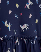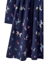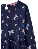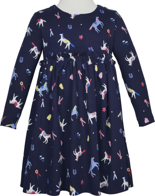 Dunkelblaues Kleid mit Rundhals und langen Armen für Mädchen von TOM JOULE. Das Kleid hat ein besonders schönes Pferde-Motiv. In der Taille befindet sich ein lockeres Gummibündchen, das für einen guten Sitz sorgt. Auf der Rückseite befindet sich ein Knopf, der das An- und Ausziehen erleichert. Das weiche Material sorgt für einen hohen Tragekomfort.