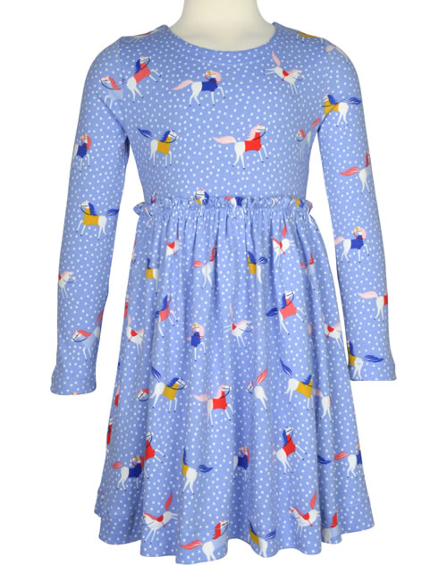 Schönes Kleid mit Rundhals und langen Ärmeln von TOM JOULE. Das tolle Motiv mit Punkten und tanzenden Pferden fällt sofort ins Auge. In der Taille befindet sich ein lockeres Gummibündchen, das für einen guten Sitz sorgt. Auf der Rückseite befindet sich ein Knopf, der das An- und Ausziehen erleichert.