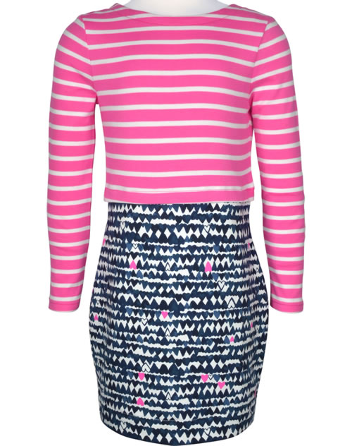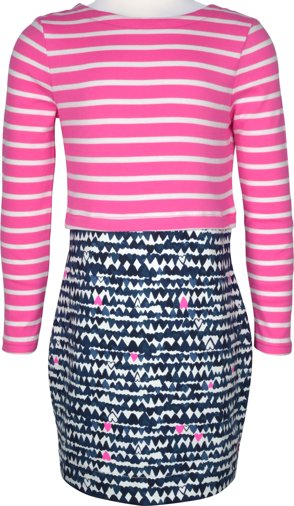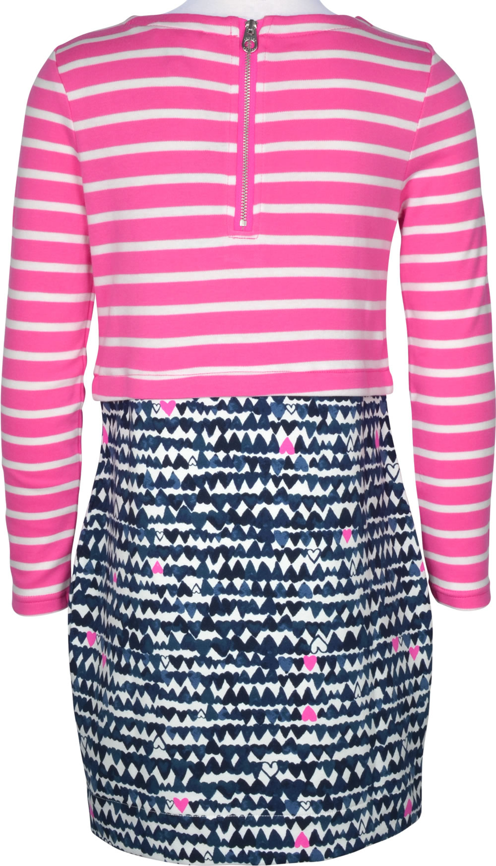 Hübsches Kleid im 2in1-Look von TOM JOULE. Der Rock ist im Herzen-Design gearbeitet und das Oberteil mit Rundhalsausschnitt ist pink und weiß gestreift. Am Rücken lässt sich das Kleid durch einen Reißverschluss schließen, der pink unterlegt ist. Das Kleid ist ideal für die kühlen Tage und für festliche Anlässe.