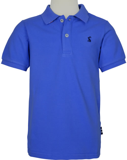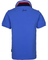 Klassisches Polo-Piqué-Shirt in blau mit verstärktem Kragen von TOM JOULE für Jungen. Am Halsausschnitt befindet sich eine typische Knopfleiste und an der linken Brustseite eine kleine Häschen-Stickerei, das Markenzeichen von TOM JOULE. Der Kragen ist auf der Unterseite blau, rot und weiß gestreift.